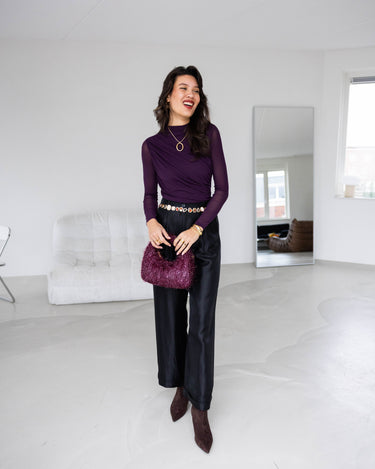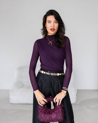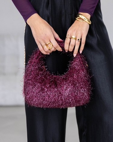 De Misha Handtas is een klein, feestelijk handtasje dat elke look direct een sparkle geeft. Het fringe-effect met subtiele lurexdraadjes zorgt voor een shiny, speels detail, terwijl de diepe burgundy kleur het tasje elegant houdt. Het handtasje heeft een korte band en wordt geleverd met een lange, bijpassende schouderband, zodat je hem makkelijk kan dragen tijdens een avondje uit of feestje.