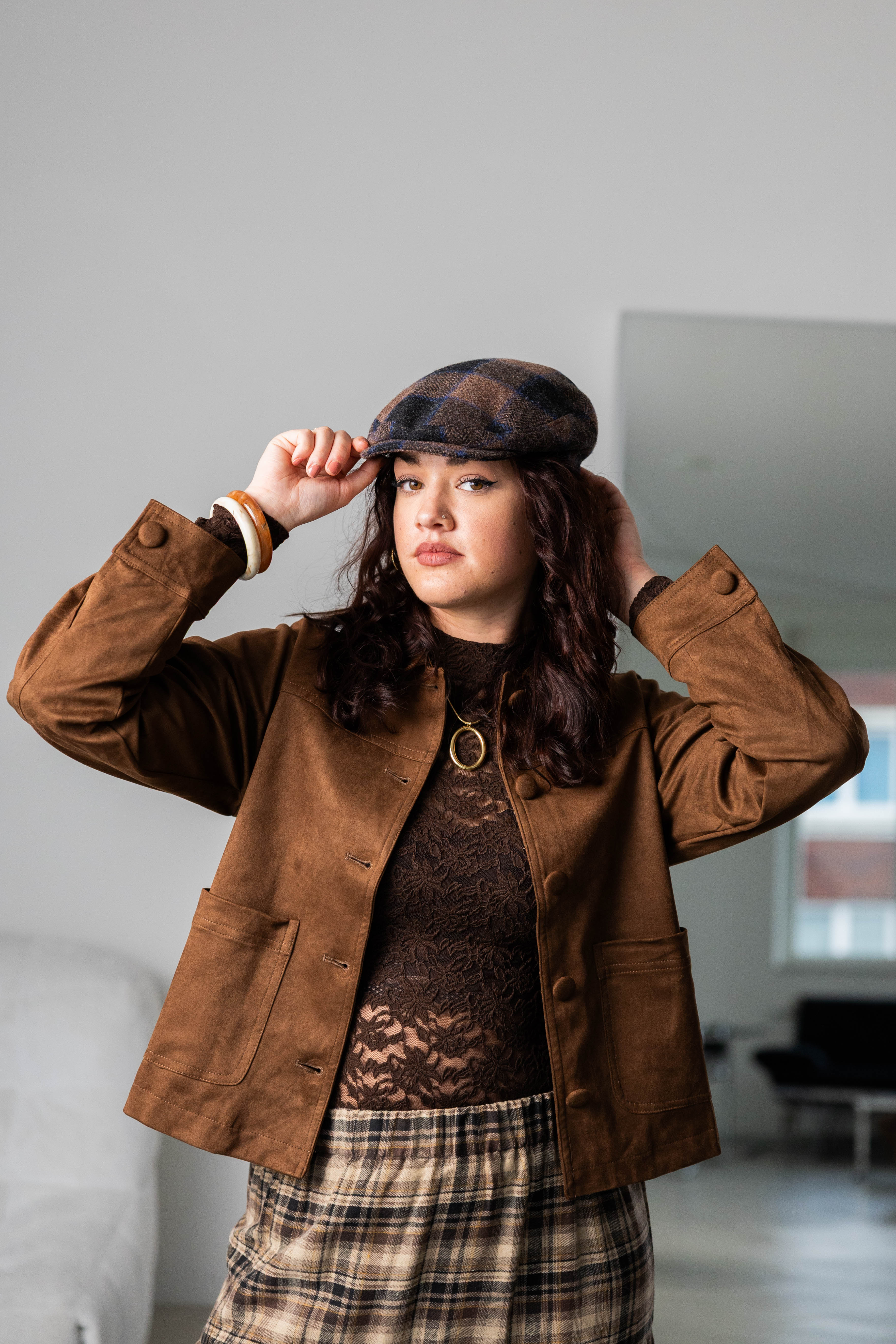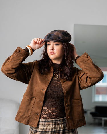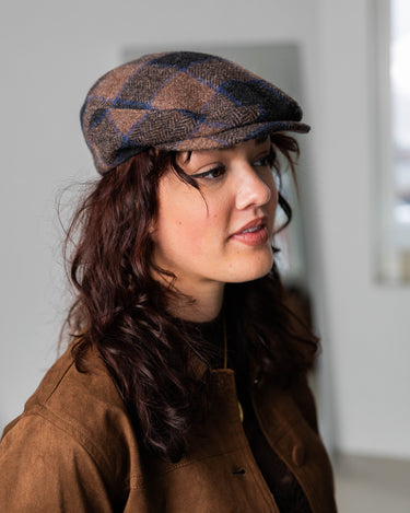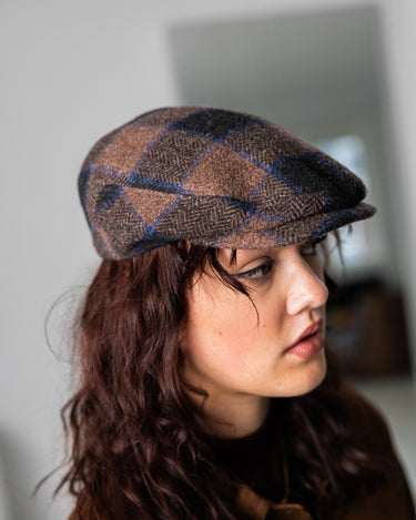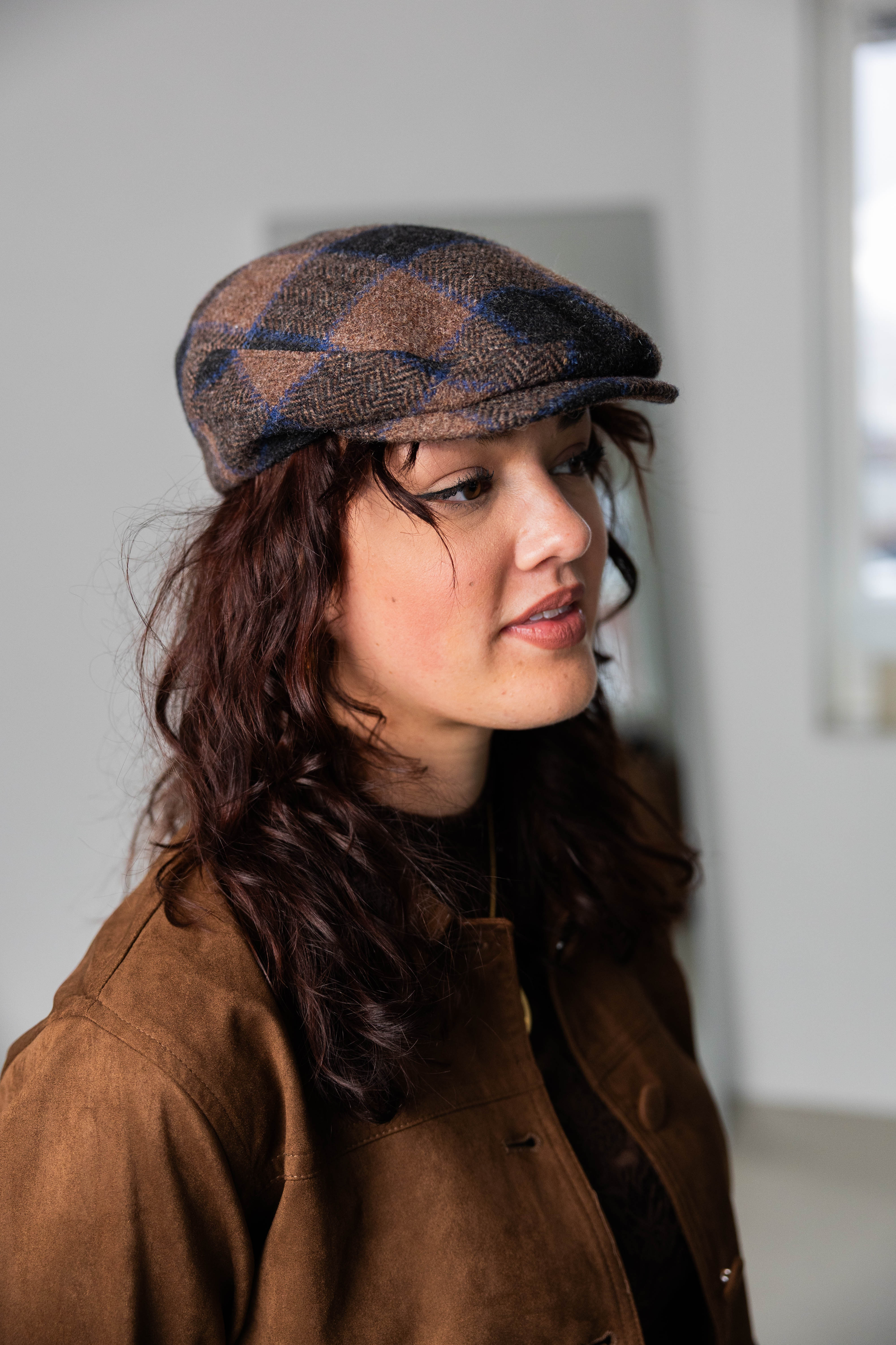 Een echte blikvanger voor je wintergarderobe: deze Flat Cap is gemaakt van 100% wol en heeft een mooi groot ruit dessin in warme bruintinten, afgewerkt met een contrasterende blauwe streep. Een klassieke stijl met een frisse twist, perfect om je outfit net dat beetje extra karakter te geven.