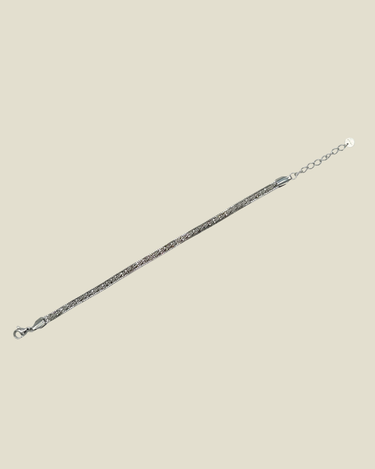 Een verfijnde armband met een subtiel, plat touwpatroon in zilverkleurig metaal. Het tijdloze en minimalistische ontwerp maakt dit sieraad perfect voor dagelijks gebruik. Draag deze armband solo of gecombineerd met andere armbanden voor een moderne, gelaagde look.