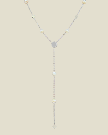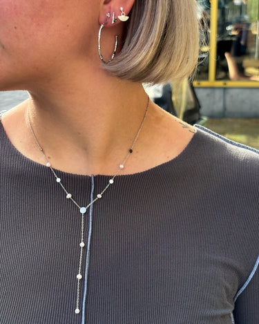 Een elegante, lange ketting met ronde parels. Het tijdloze ontwerp geeft een verfijnde en chique uitstraling, ideaal om solo te dragen of om te combineren met kortere kettingen voor een gelaagde, moderne look.