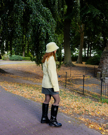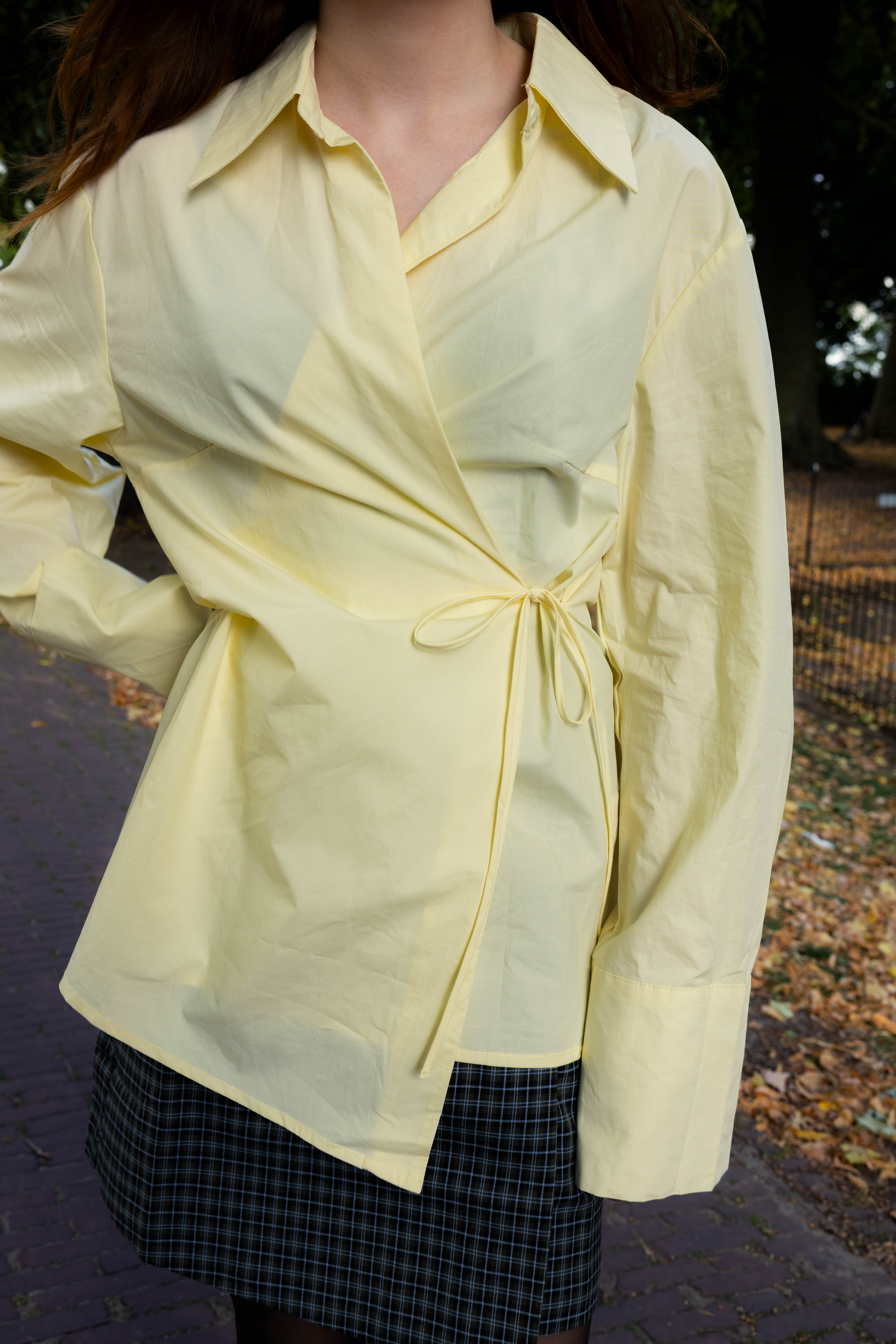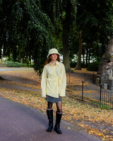 Botergele overslagblouse. Leuk te combineren met een rokje en stoere boots.