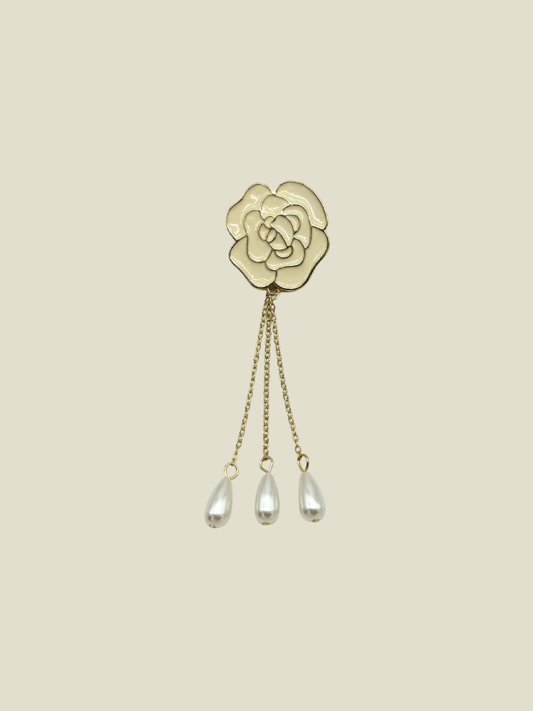 Een elegante broche met een witte bloem en een sierlijke ketting met pareltjes. Het verfijnde en vrouwelijke ontwerp maakt dit sieraad een stijlvolle en opvallende toevoeging aan elke outfit.