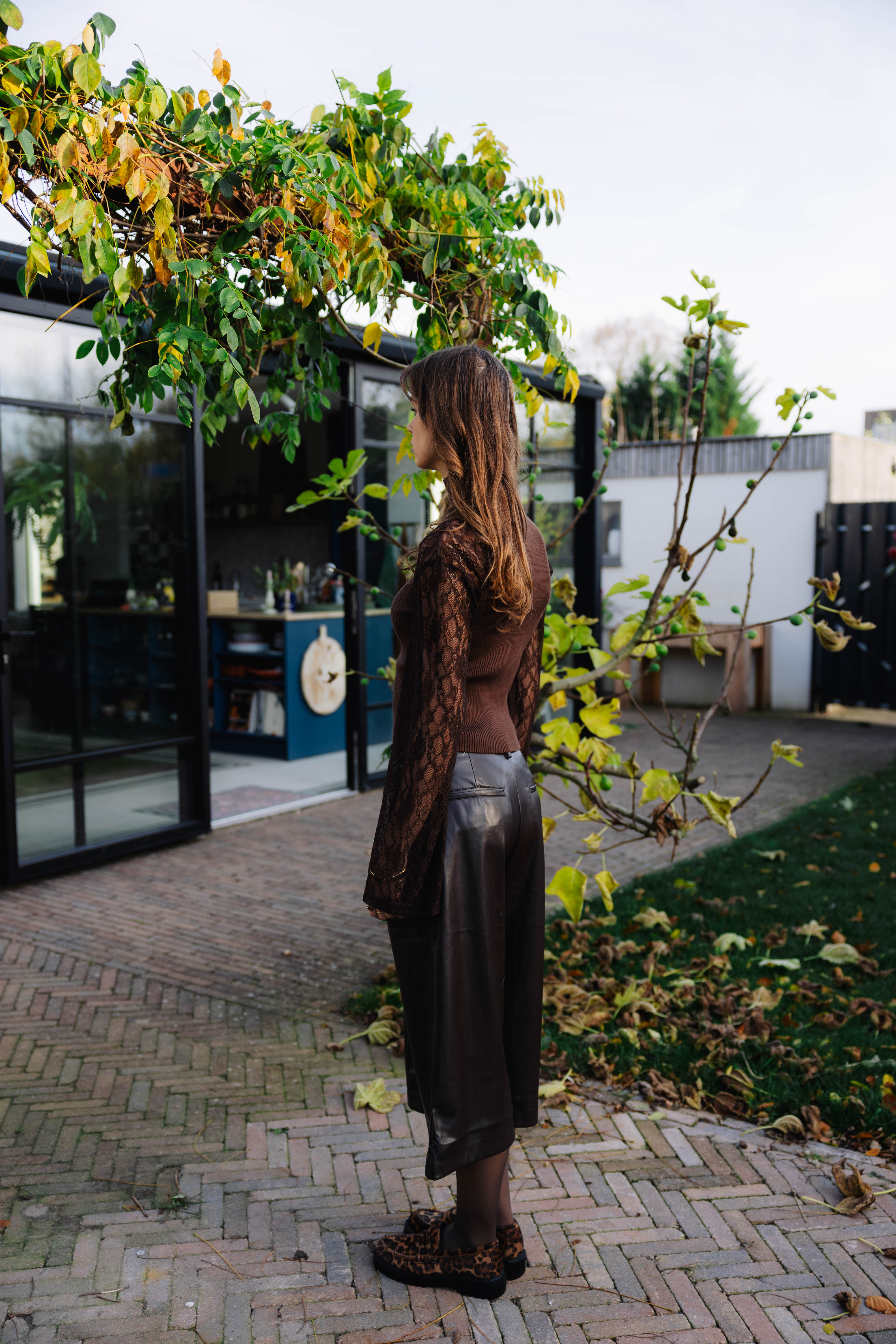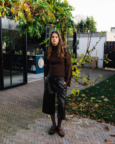 De Suki Culotte is een PU leren broek in een warme bruine kleur, uitgevoerd in een comfortabele vegan kwaliteit. De culotte heeft steekzakjes aan de zijkant en een bandplooi aan de voorkant, en valt elegant tot over de knie. Combineer hem met hoge laarzen en een wollen trui voor een stijlvolle mix van texturen en een moderne look.