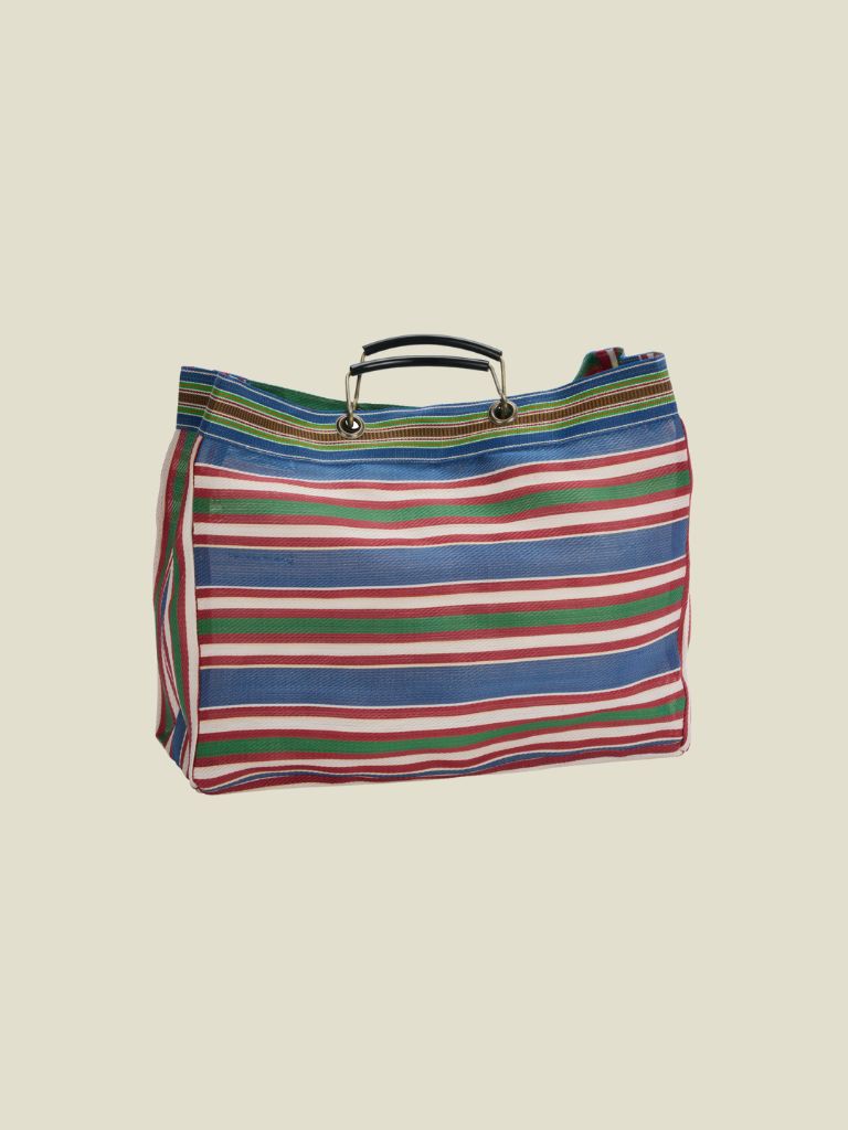 Deze gerecyclede PP-shoppertas heeft een iconisch streepjespatroon en een praktische magneetsluiting. Gemaakt van 100% gerecycled PP/PE-plastic afkomstig van cementzakken, is hij lichtgewicht, duurzaam, waterafstotend en gemakkelijk schoon te maken. Ideaal voor dagelijkse boodschappen, training of als extra reistas.