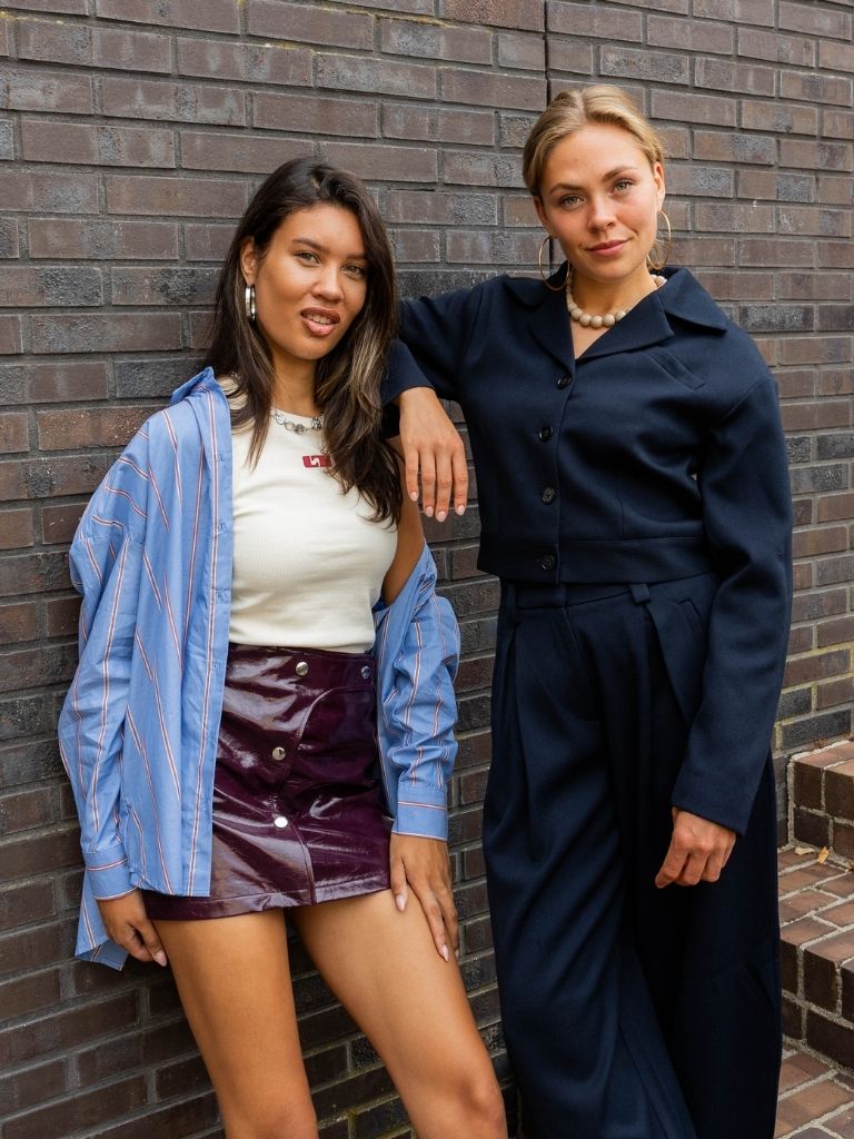 - Asymmetrische sluiting aan voorkant met metallic zilveren drukknopen