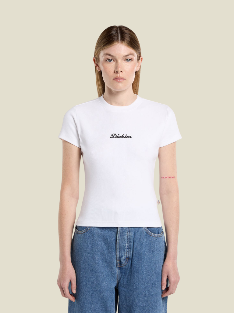 Het Wellsville T-shirt van Dickies is een perfecte basic met een vrouwelijke twist. De aansluitende, getailleerde pasvorm en hoge ronde hals geven dit witte T-shirt een cleane en moderne uitstraling. Het speelse zwarte Dickies-logo op de voorkant zorgt voor een subtiel statement. Dankzij de mix van katoen en elastaan voelt het shirt comfortabel aan en beweegt het mooi met je mee. Ideaal om te dragen onder een jasje of juist solo op een jeans of rok.