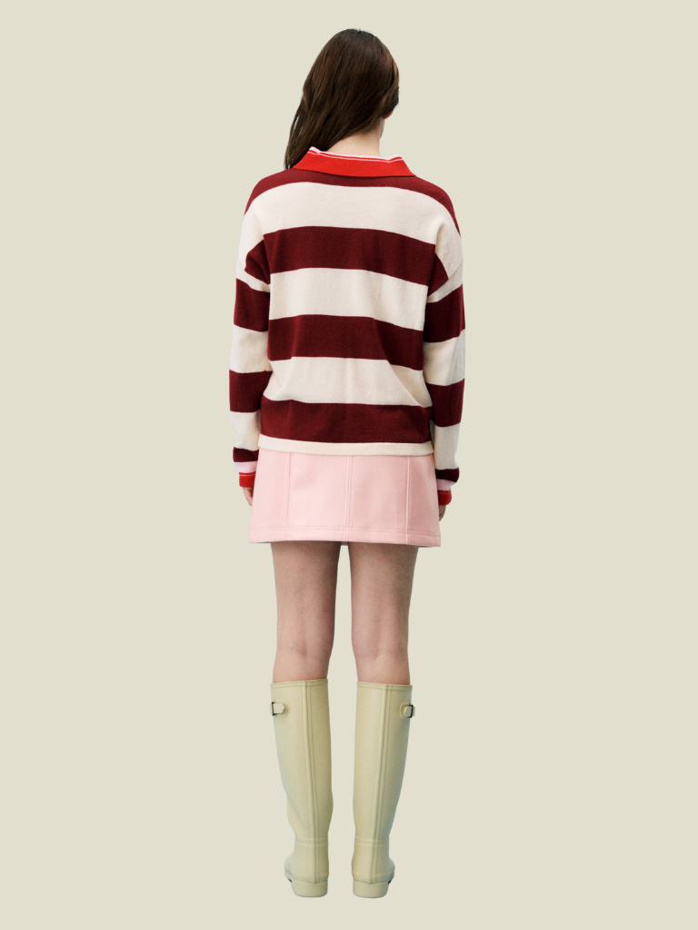 Ecru met bordeauxrode streep + polo-kraagje in roze met rode bies – sportief en speels