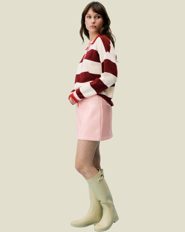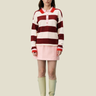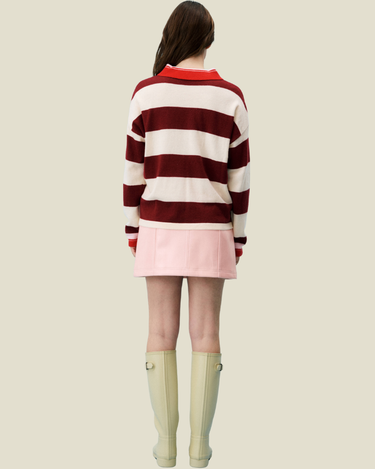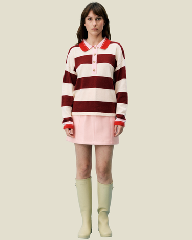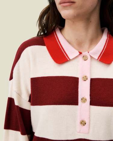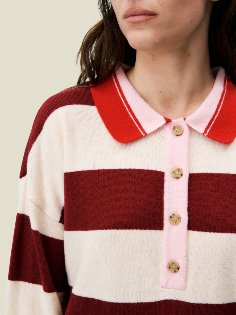 De Amboise trui van FRNCH is een speelse, sportieve must-have. De ecru basis met bordeauxrode streep krijgt een vrolijk accent door het polo-kraagje in roze met rode bies. De knopen bij de nek maken de trui extra charmant, terwijl de oversized pasvorm zorgt voor comfort en een casual uitstraling.