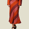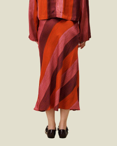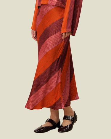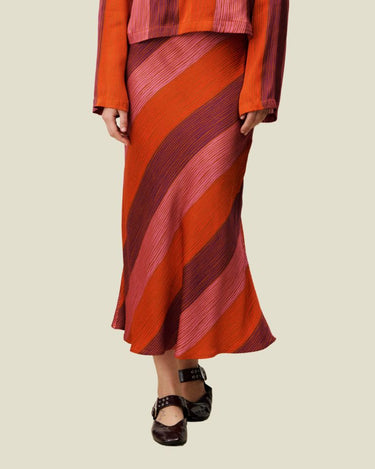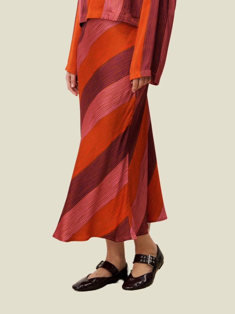 De Skirt Khan Rayures van FRNCH is een elegante, langere rok met prachtige strepen in warme oranje- en paarstinten. De soepelvallende 100% viscose stof geeft de rok een luchtige, vrouwelijke beweging bij elke stap. Dankzij het tijdloze model en de stijlvolle kleurencombinatie is dit een item dat je zowel chic als casual kunt dragen.