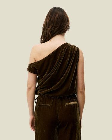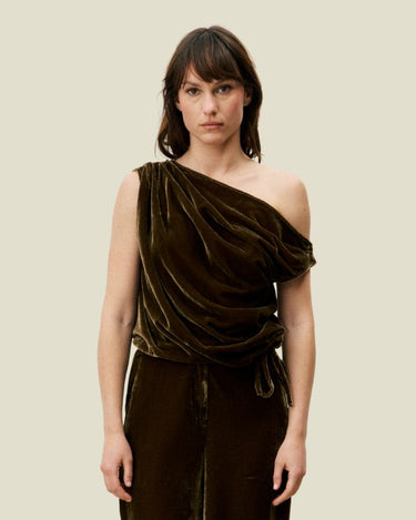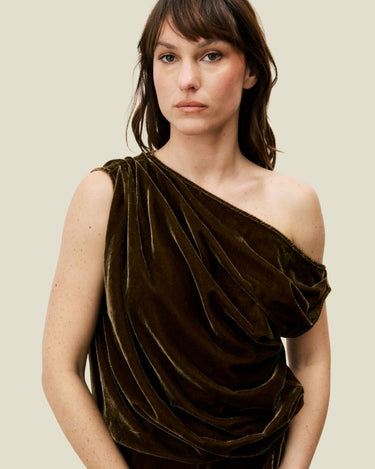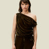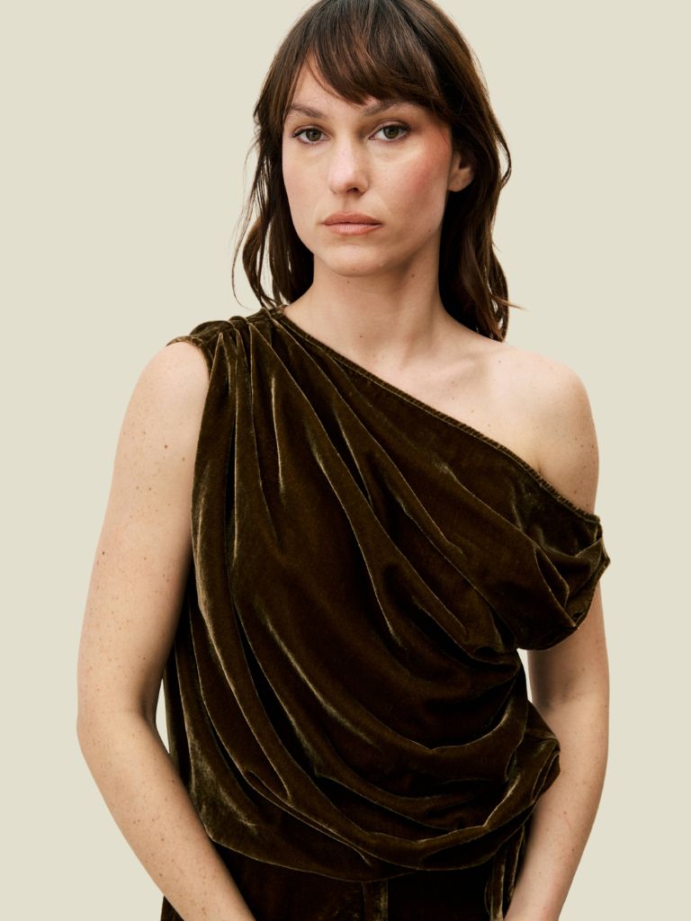 De Top Anita Marron Glacé heeft een elegante, vloeiende snit die prachtig om het lichaam valt. Het asymmetrische one-shoulder ontwerp geeft de top een moderne, vrouwelijke uitstraling. Dankzij de zachte velvet stof in een unieke iced brown tint straalt hij luxe en warmte uit. Met de afneembare ceintuur kun je de taille extra accentueren, of je draagt hem zonder voor een nonchalante, soepel vallende look.