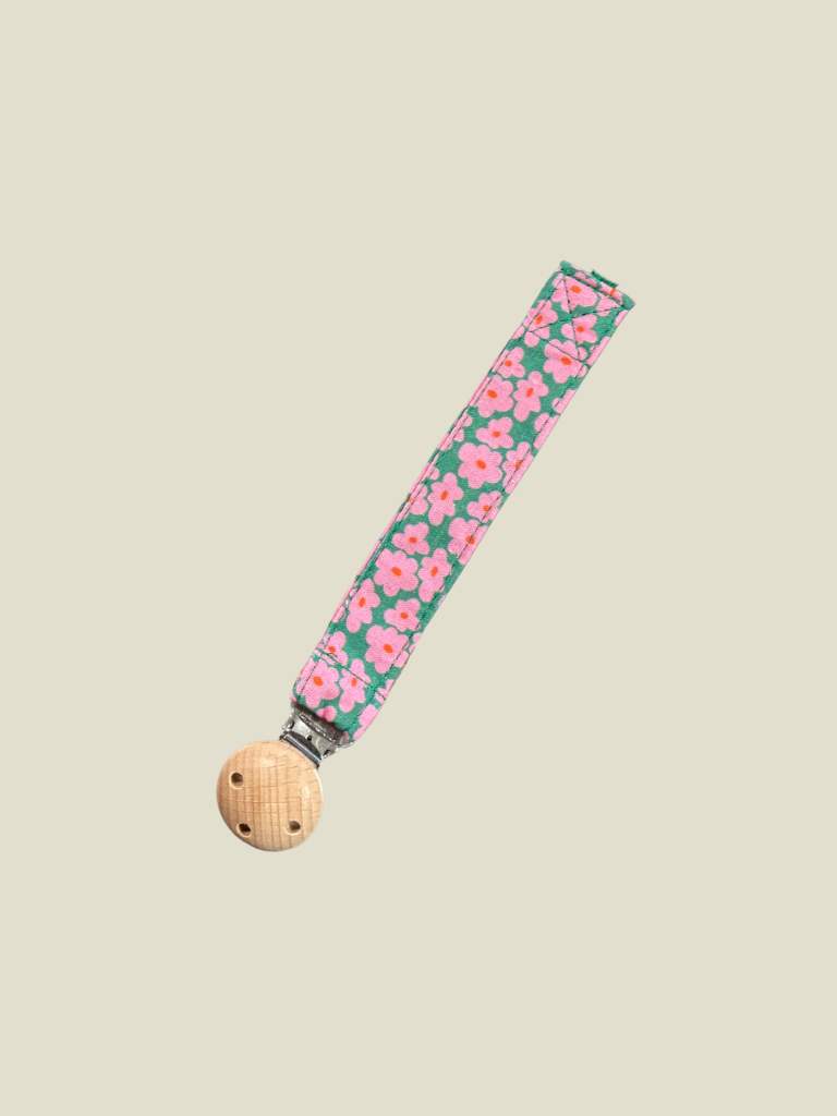 De Pacifier Cord Flowers Green combineert praktische functionaliteit met een vrolijk, speels design. Het speenkoord is gemaakt van stevig, zacht geweven stof en voorzien van een houten clip. Het groene koord met roze bloemen print geeft een frisse uitstraling en past bij zowel casual als chique babyoutfits.