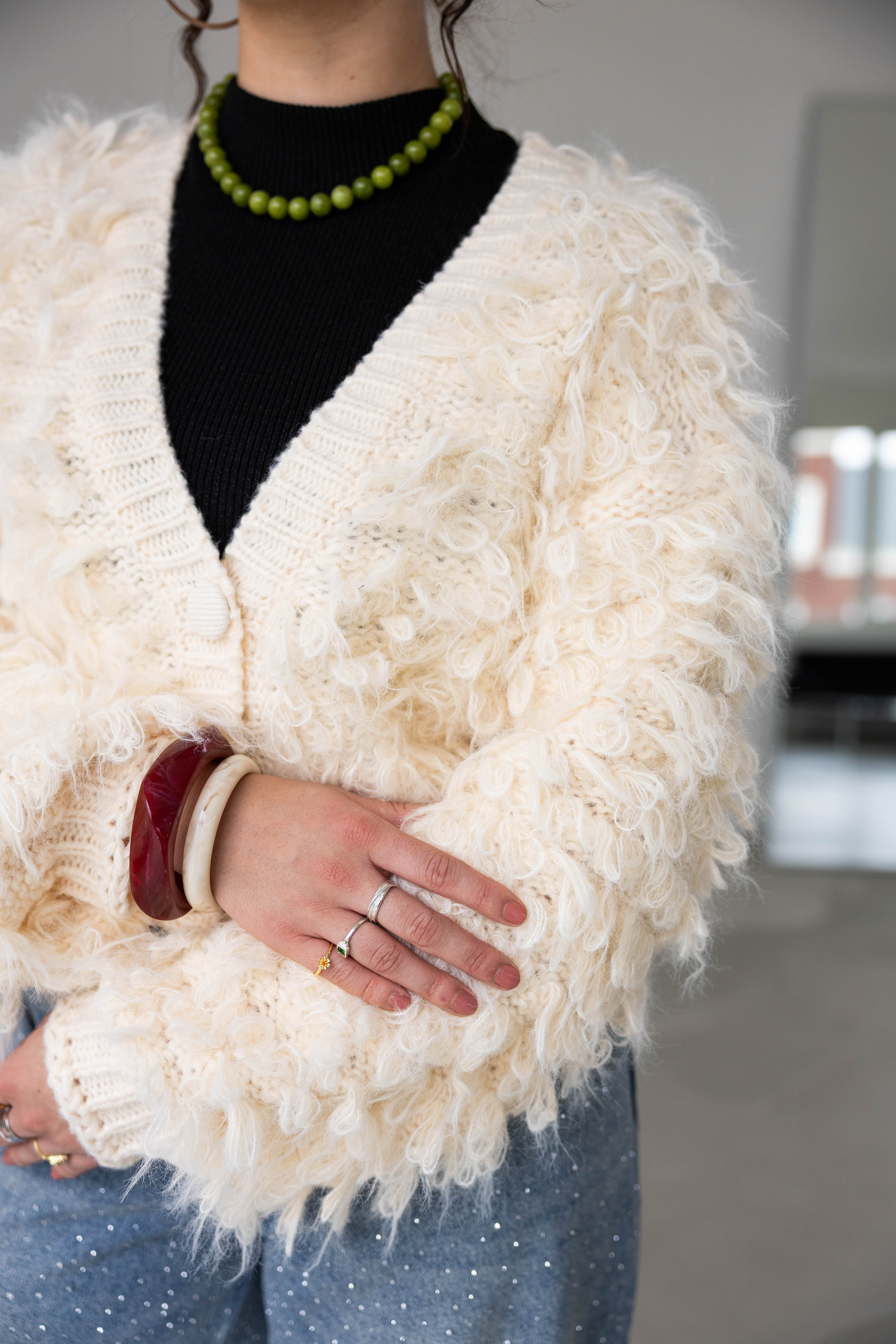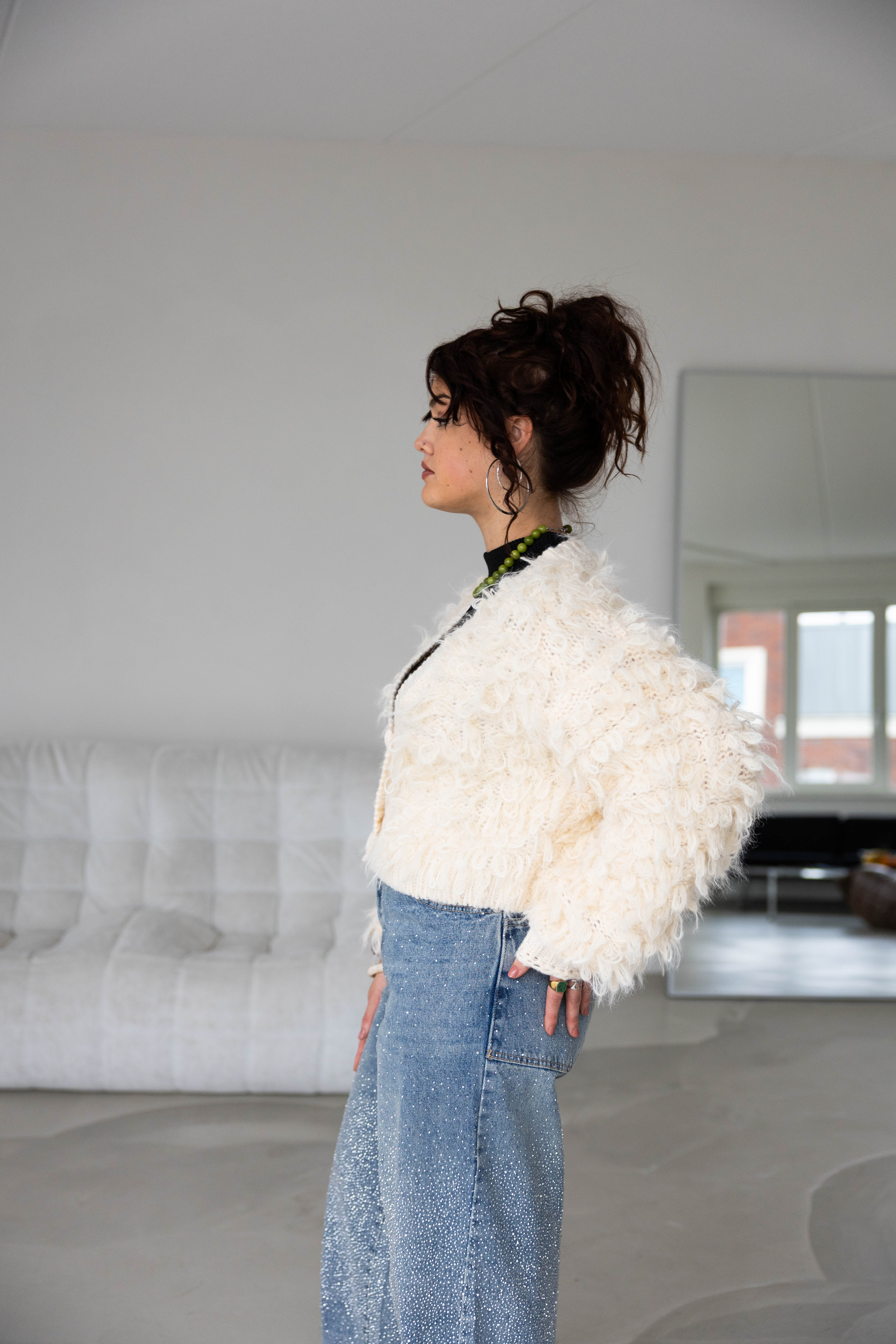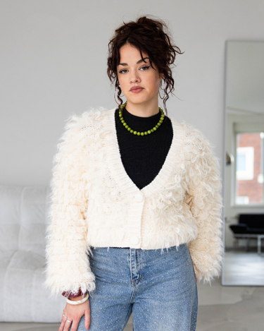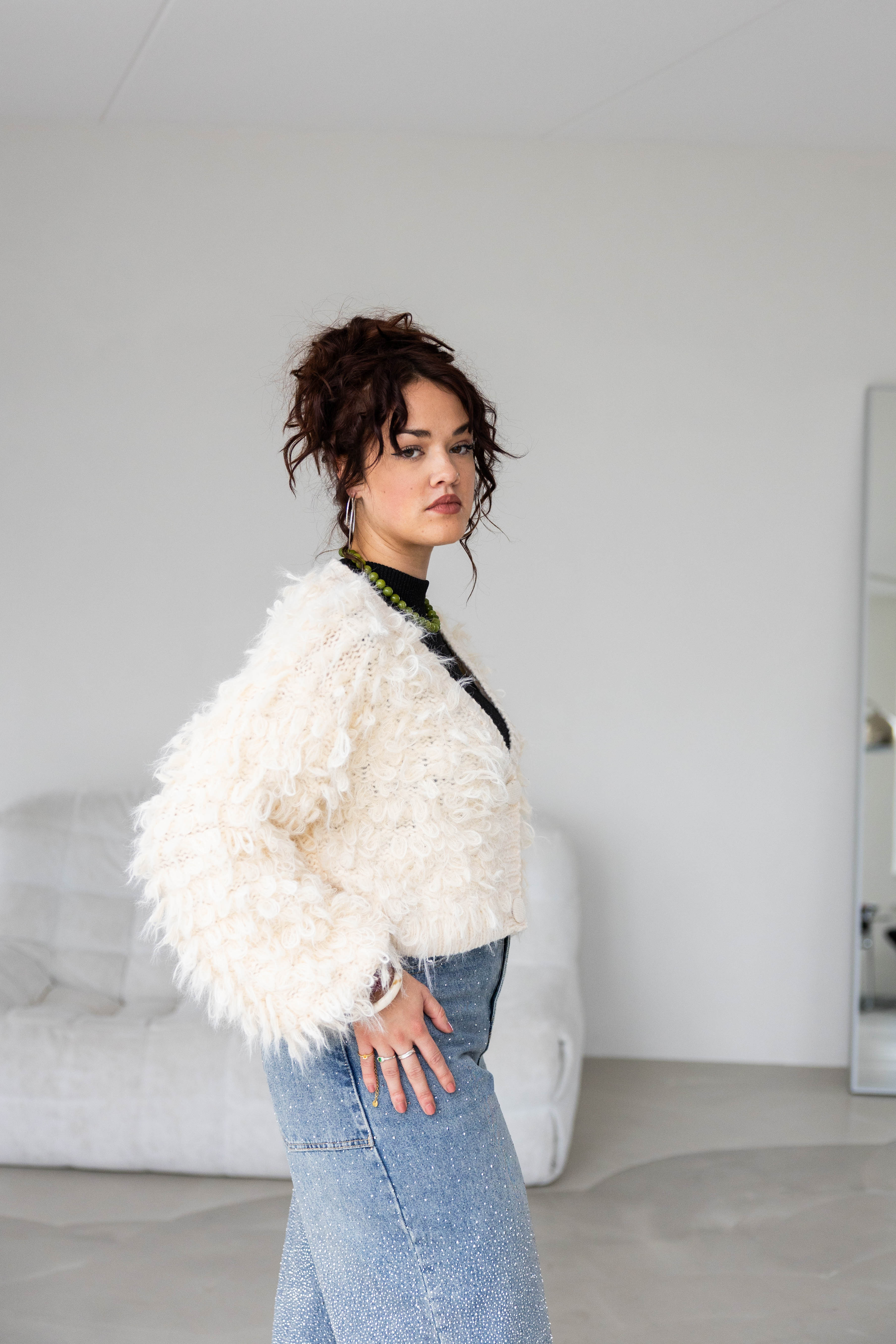 De Muna Cardigan is een kort, stijlvol vest met wijd uitlopende mouwen en een uniek gebreid patroon dat speels textuur toevoegt. De boorden bij de polsen geven de mouwen een subtiel ballon-effect, terwijl de knoopsluiting aan de voorkant zorgt voor een nette afwerking.