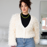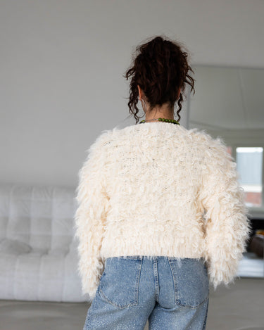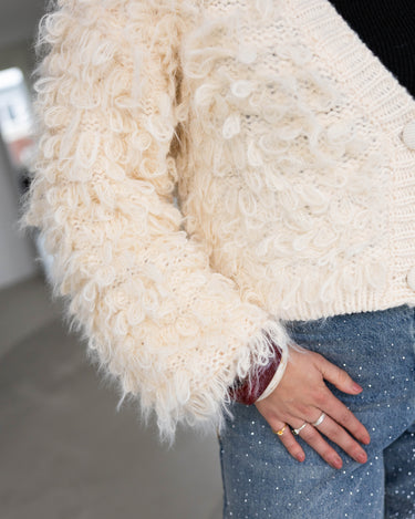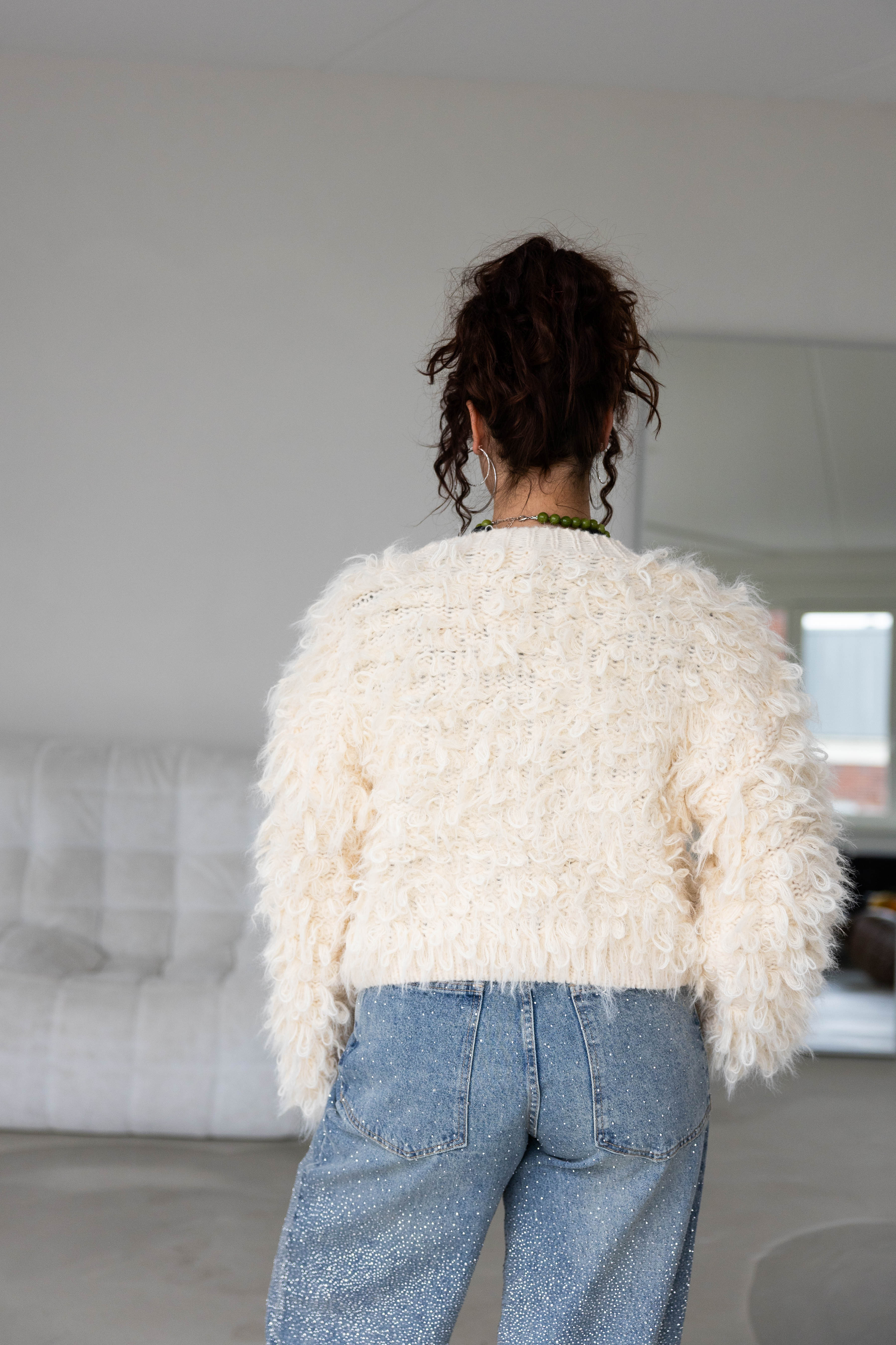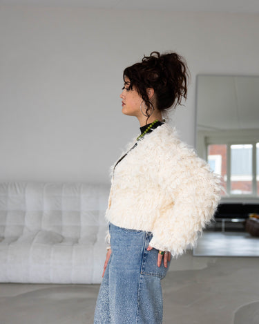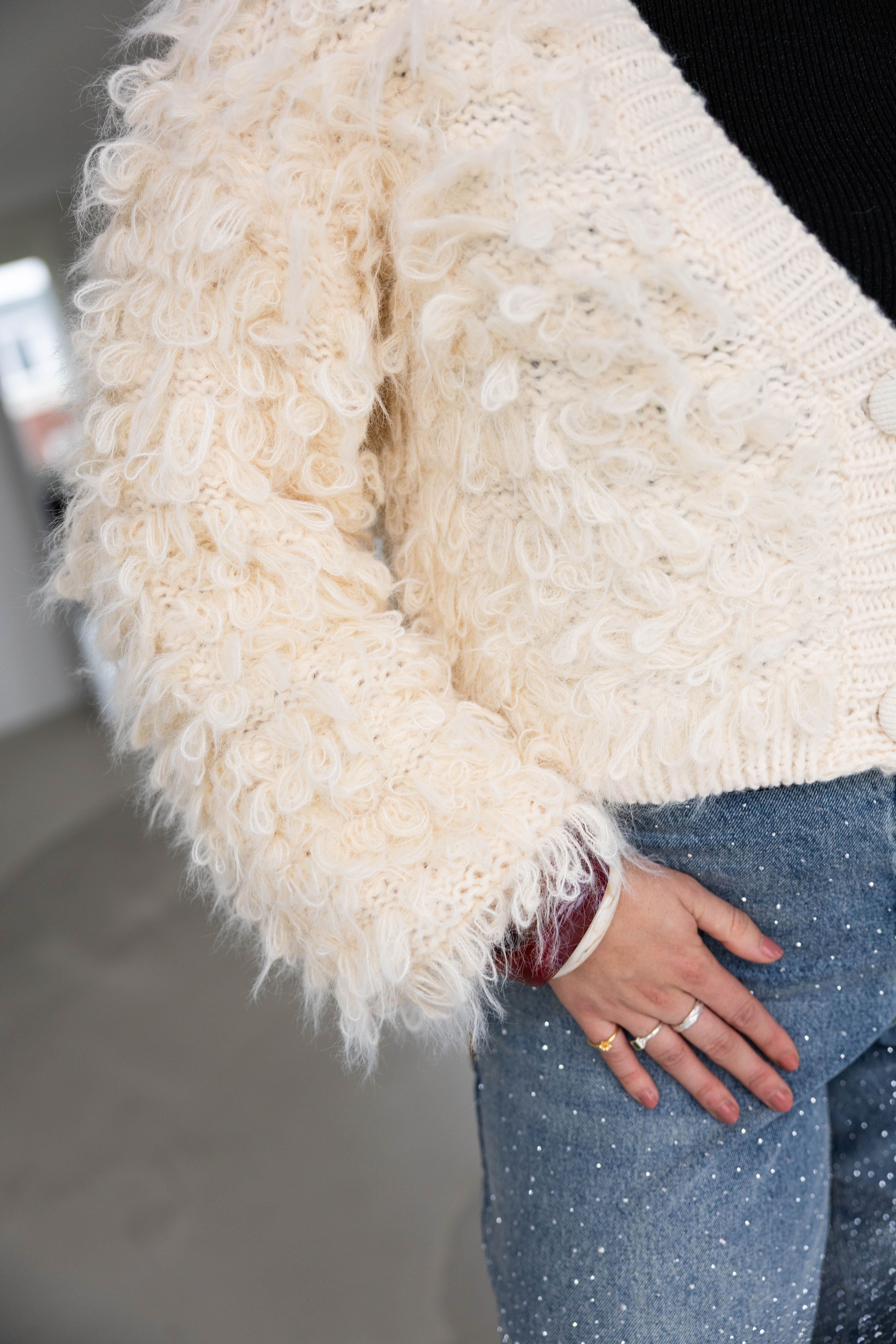 De Muna Cardigan is een kort, stijlvol vest met wijd uitlopende mouwen en een uniek gebreid patroon dat speels textuur toevoegt. De boorden bij de polsen geven de mouwen een subtiel ballon-effect, terwijl de knoopsluiting aan de voorkant zorgt voor een nette afwerking.