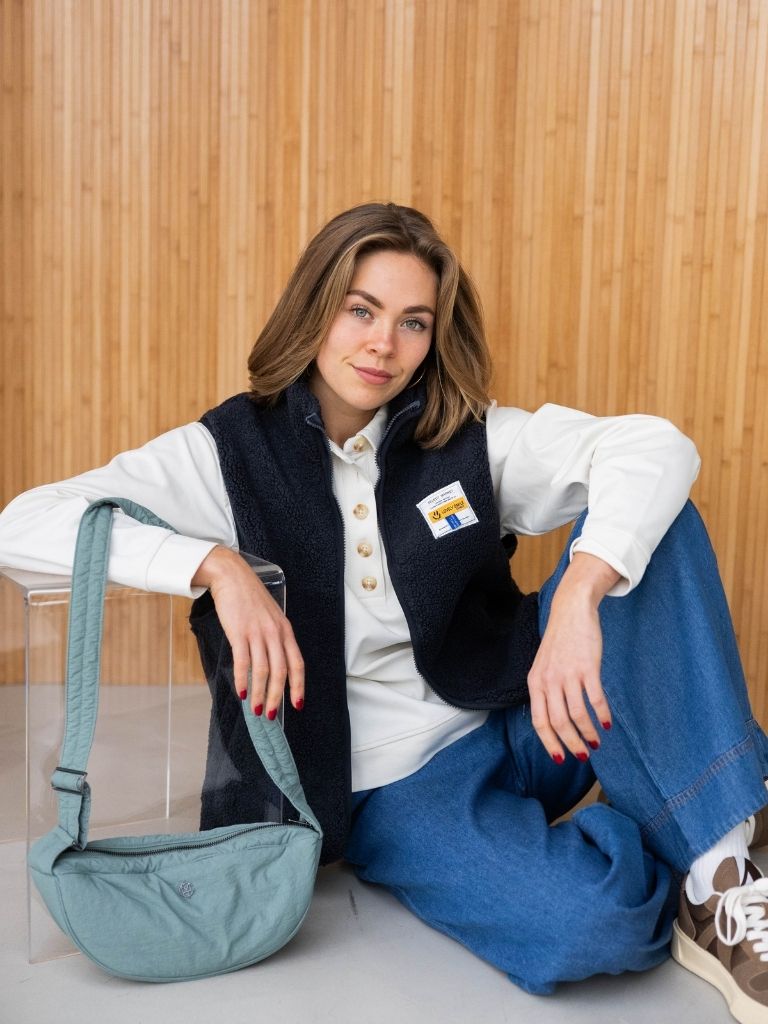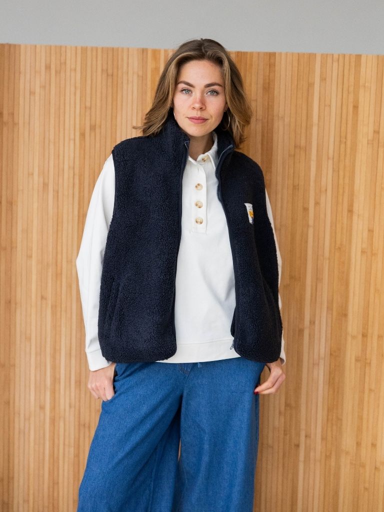 De Emi Gilet in grey is een zacht en stoer teddy gilet met een opstaande kraag en een outdoorsy vibe. Het oversized model valt lekker ruim en heeft een ritssluiting, twee steekzakjes aan de zijkant en een speels labeldetail dat het gilet nét dat beetje extra geeft. De binnenkant voelt heerlijk zacht aan, perfect voor extra comfort.