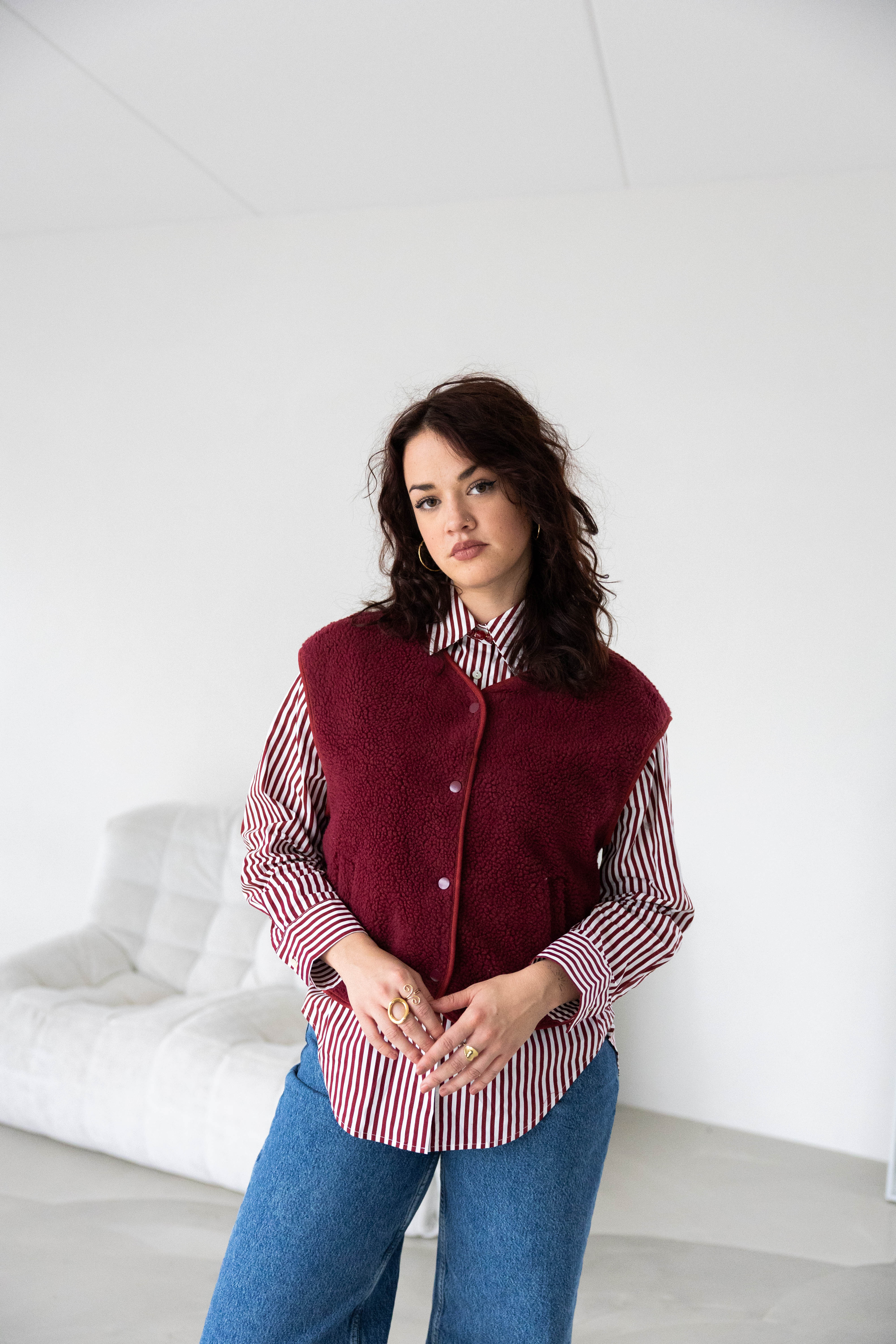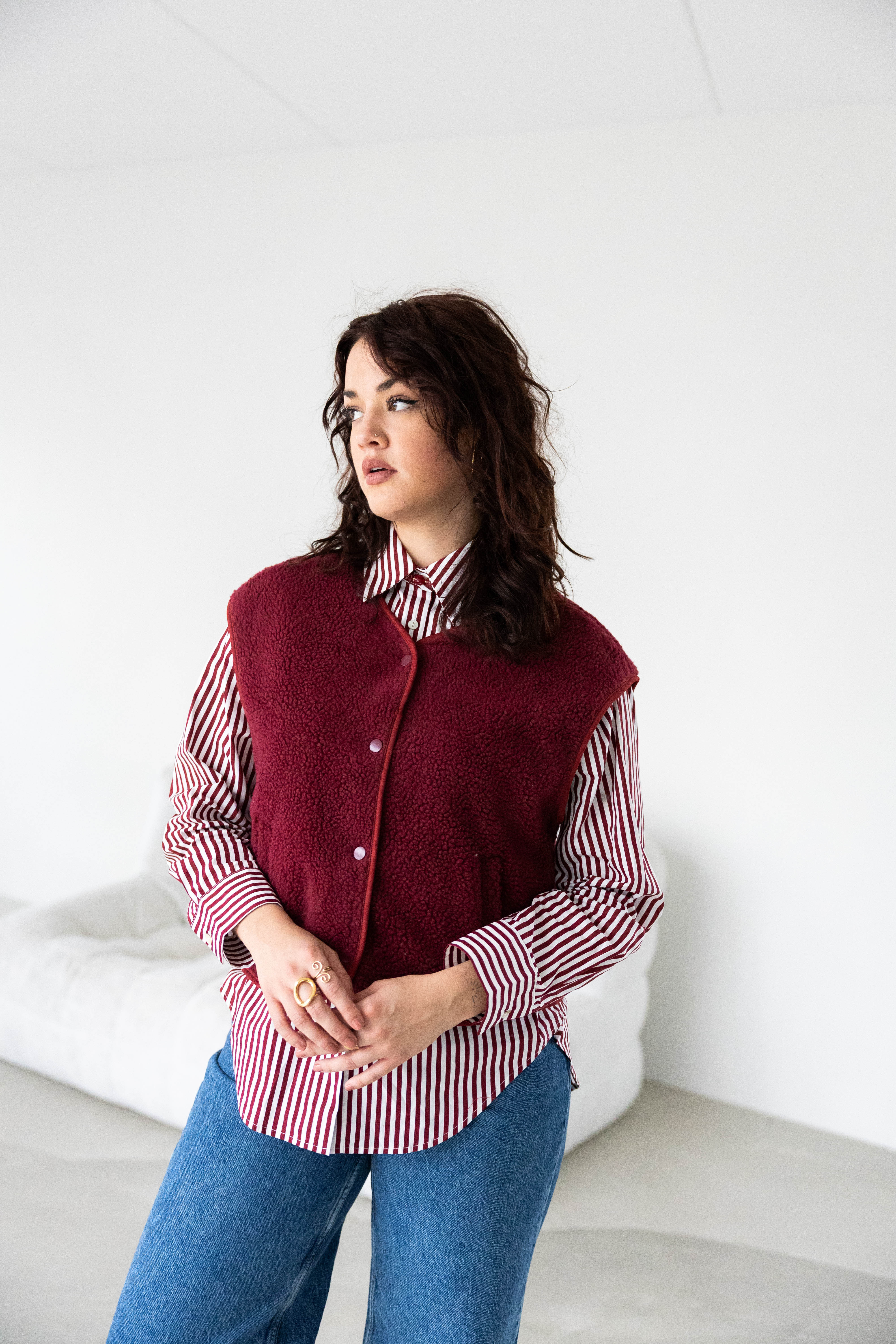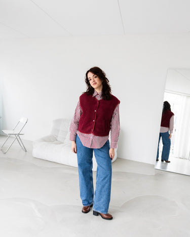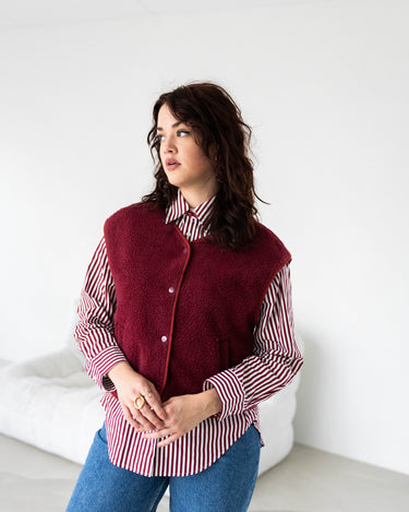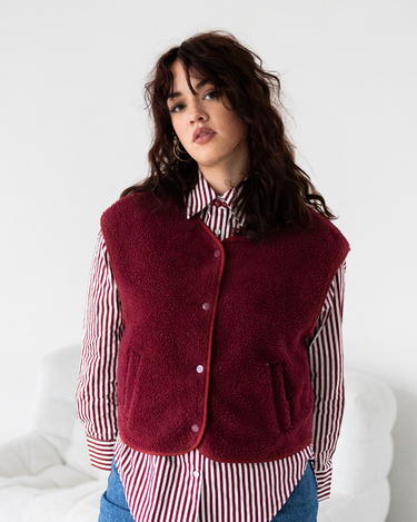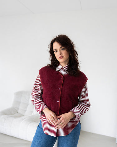 De Marly Gilet in bordeaux is een heerlijk teddy gilet met een gevoerde binnenkant voor extra comfort. Het boxy model is korter en wijder, waardoor het gilet lekker oversized valt en een relaxte, moderne look geeft. Bordeauxkleurige drukknopen maken het af en voegen een subtiel detail toe.