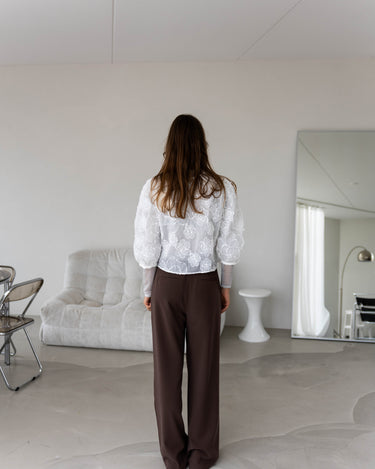 De mix van gerecycled polyester, viscose, polyester en elastaan maakt de stof stevig maar soepel, met precies genoeg stretch voor een relaxed draaggevoel. Gerecycled polyester zorgt voor vormvastheid en onderhoudsgemak, terwijl viscose de stof zacht en ademend maakt.