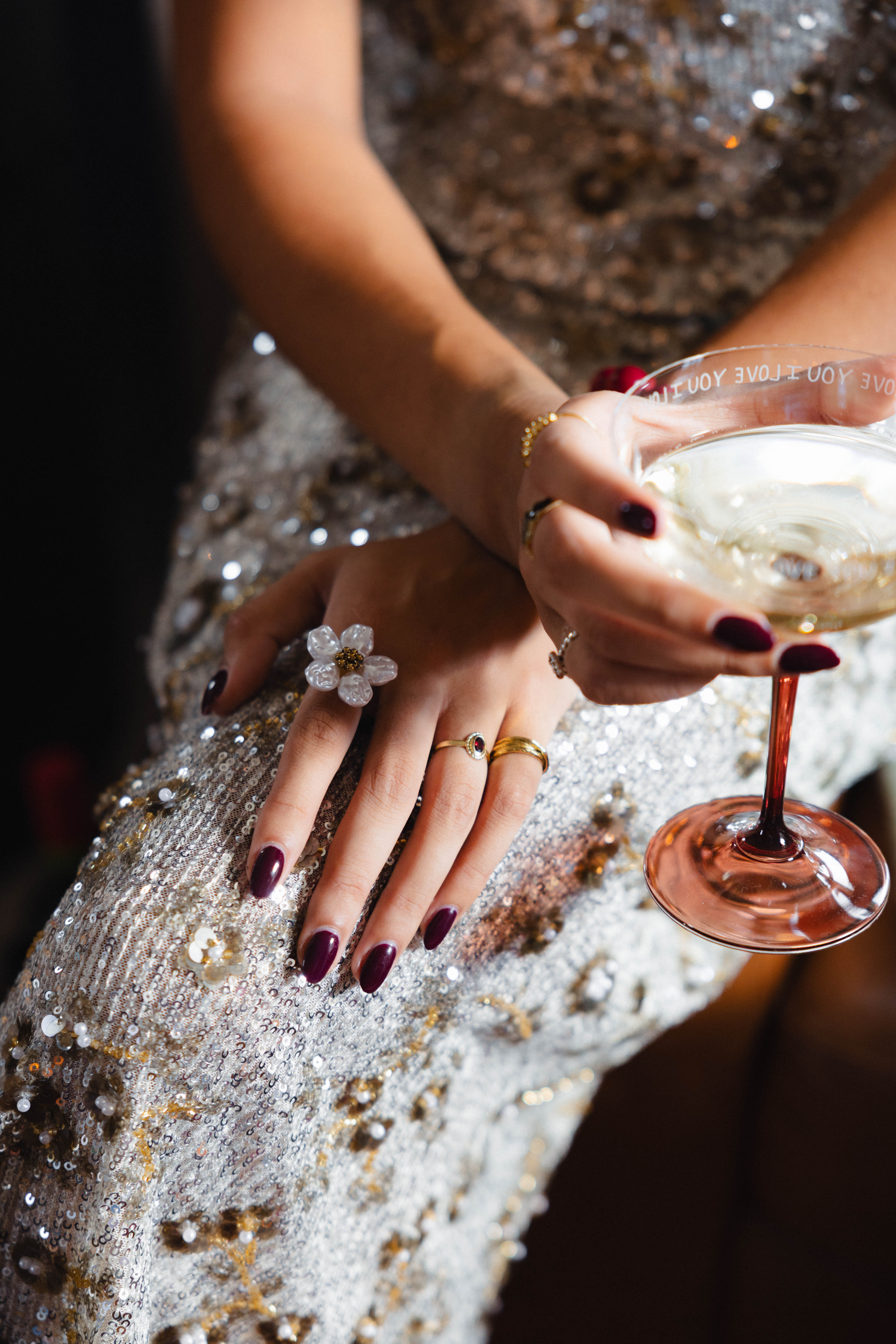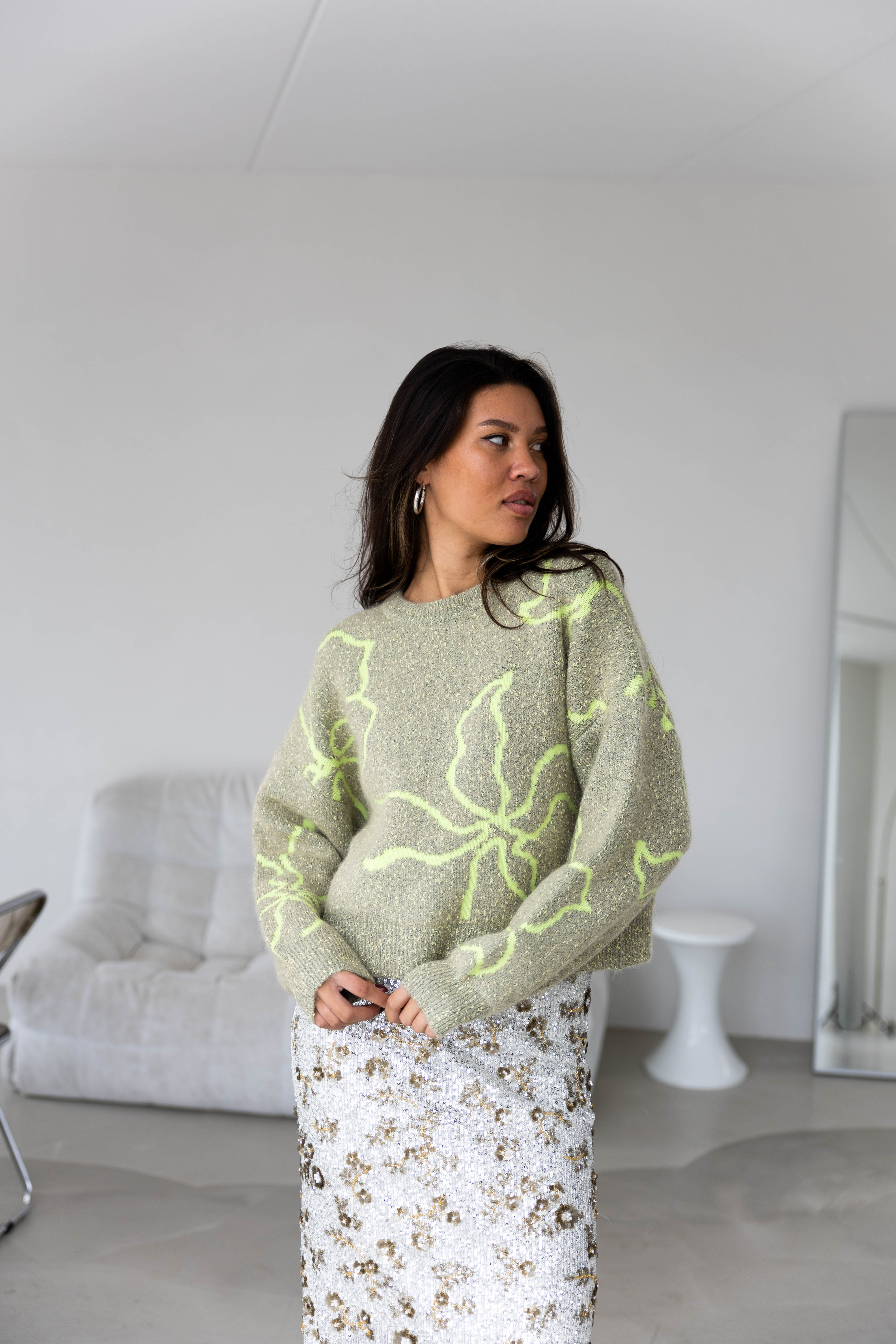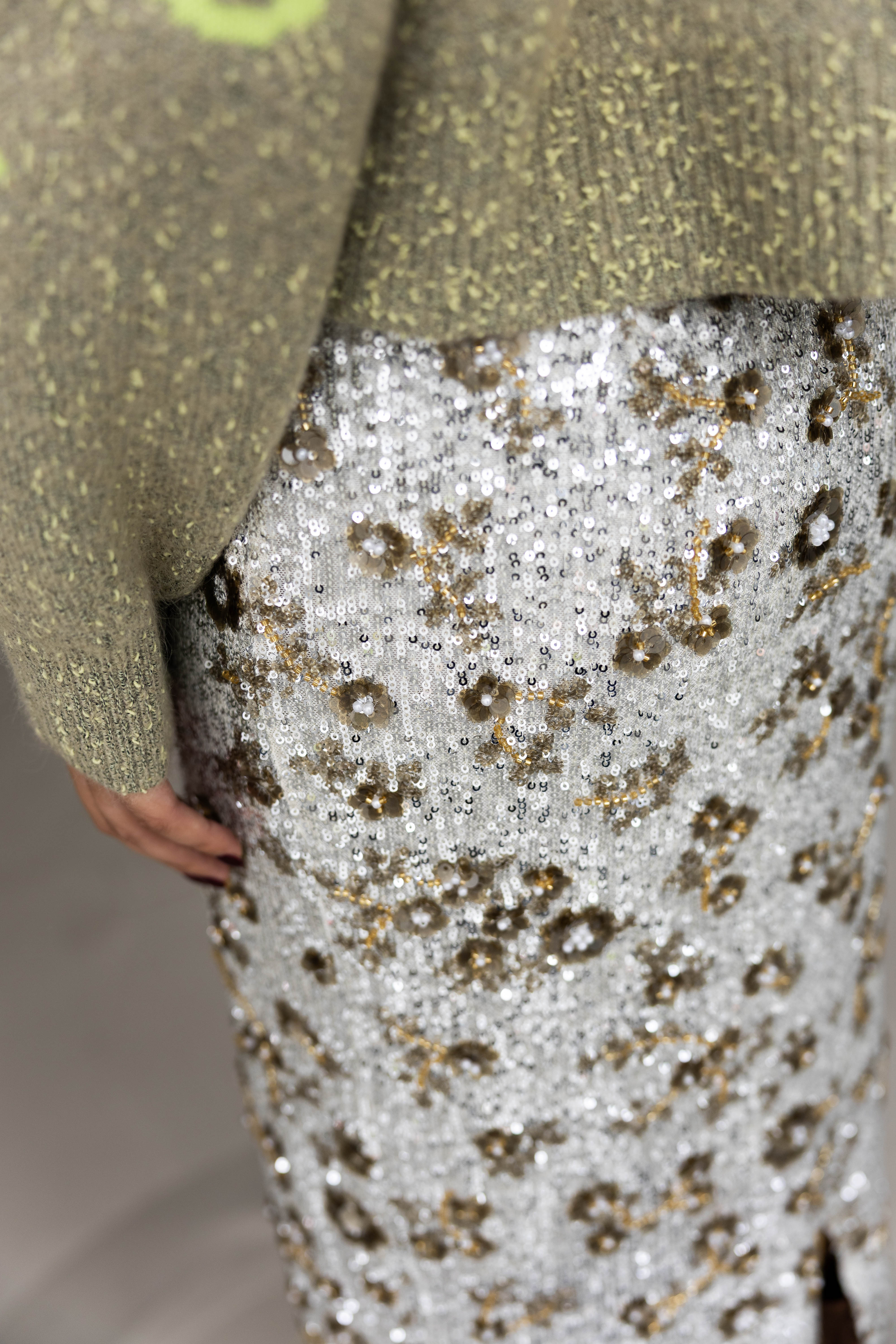 • Glinsterende pailletten in zilver- en taupetinten voor een elegante uitstraling