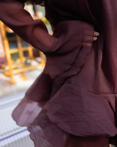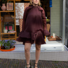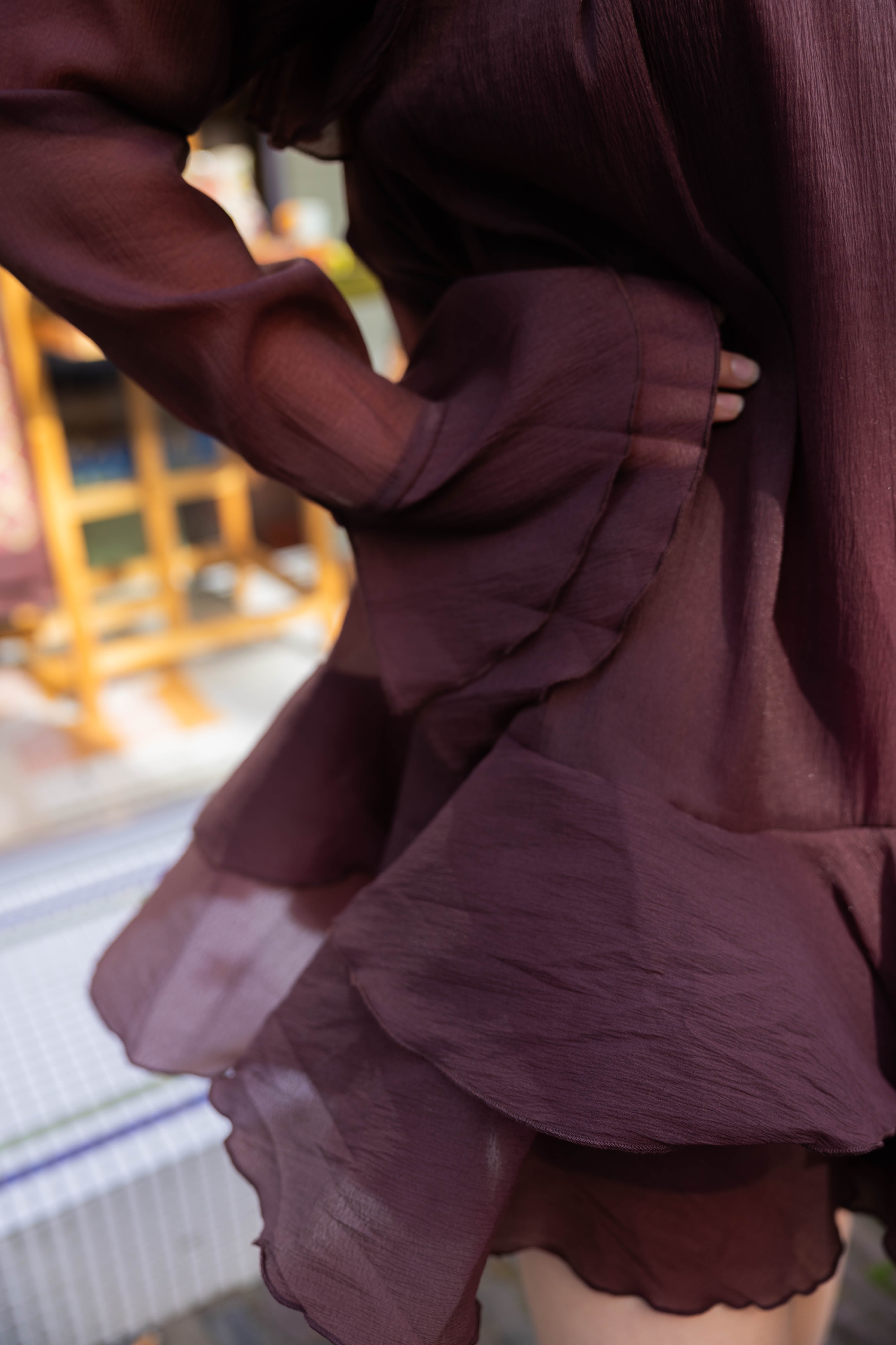 Sierlijk donkerrood jurkje van een licht doorschijnende stof, afgewerkt met elegante ruffles en wijde mouwen. Het bijpassende onderjurkje zorgt voor een comfortabele pasvorm en een verfijnde uitstraling. Perfect voor een avondje uit of een speciale gelegenheid.