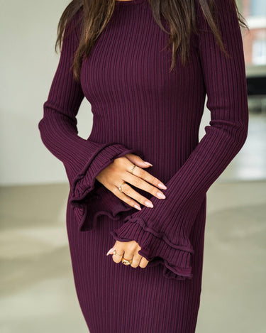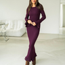 Een prachtige lange, aansluitende jurk van stretchy materiaal met geplooide mouwtjes en een subtiel afgewerkte onderkant. Comfortabel, elegant en perfect voor verschillende gelegenheden.