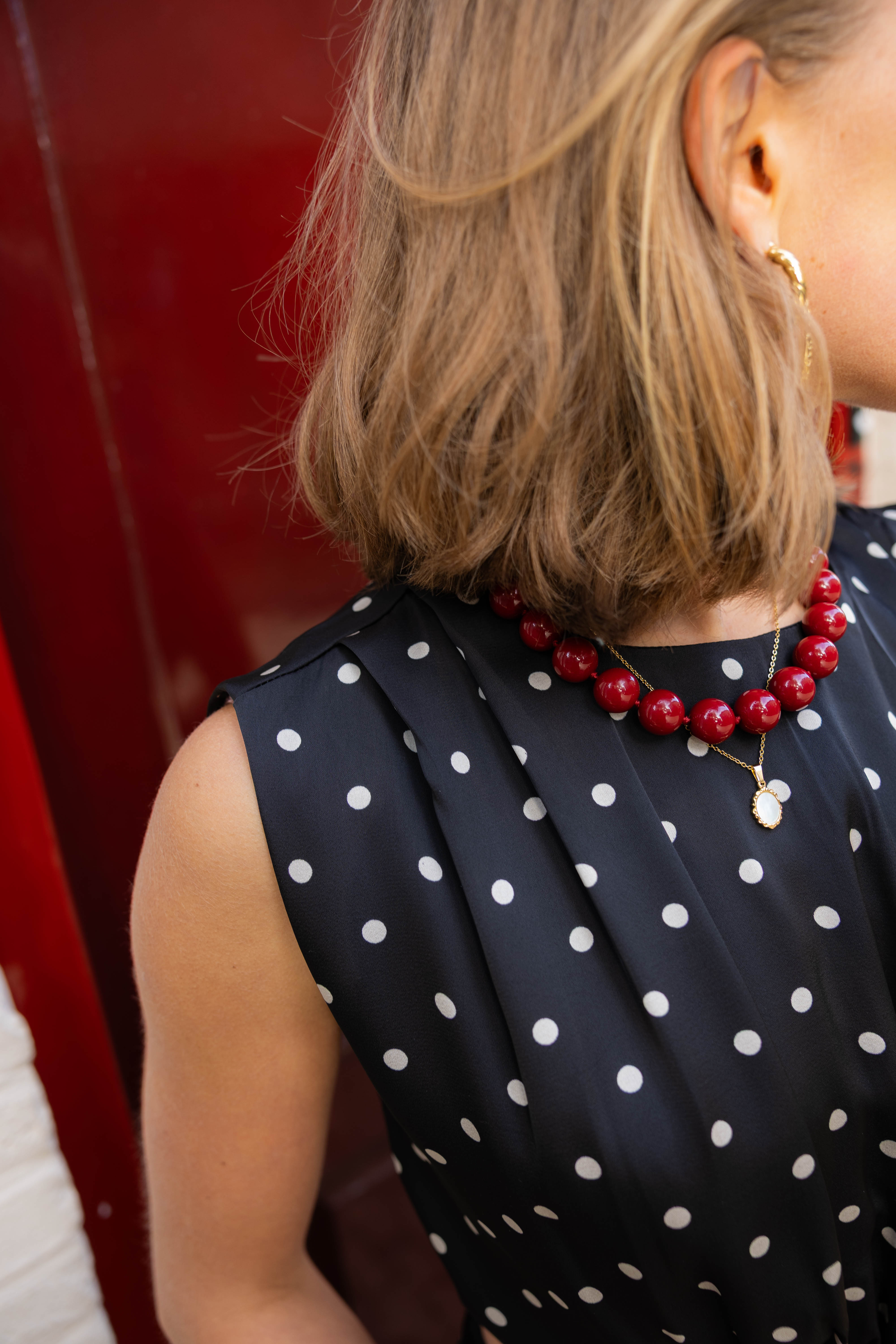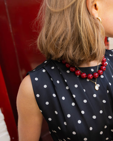 Sierlijke soepel vallende two-piece jurk met stippen en gouden accent. Perfect voor een speciale gelegenheid.
