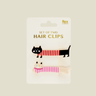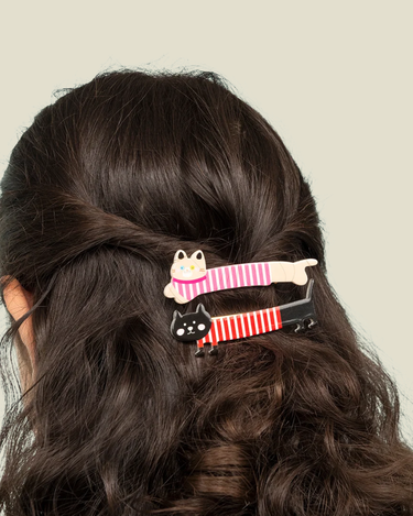 Deze set van 2 haarclips is versierd met schattige katjes: één zwarte kat met een rood-wit gestreepte trui en één lichtroze kat met een roze-wit gestreepte trui. De metalen veerclips (6 x 0,6 cm) houden een pluk haar stevig op zijn plek.