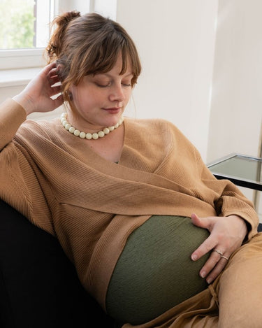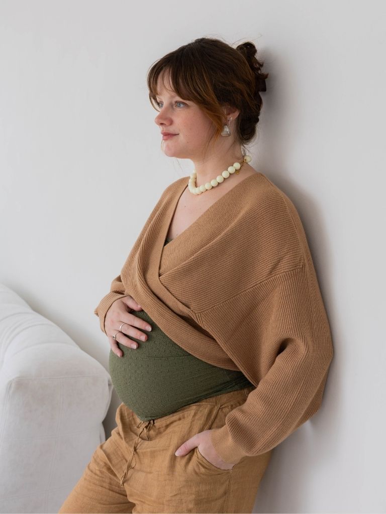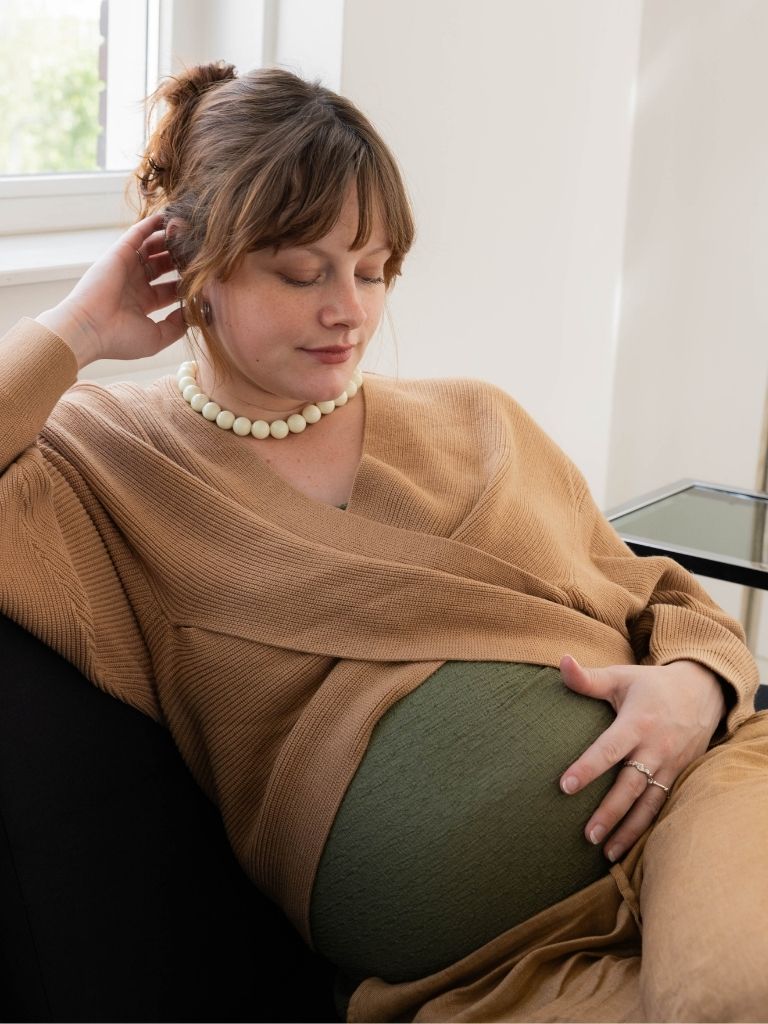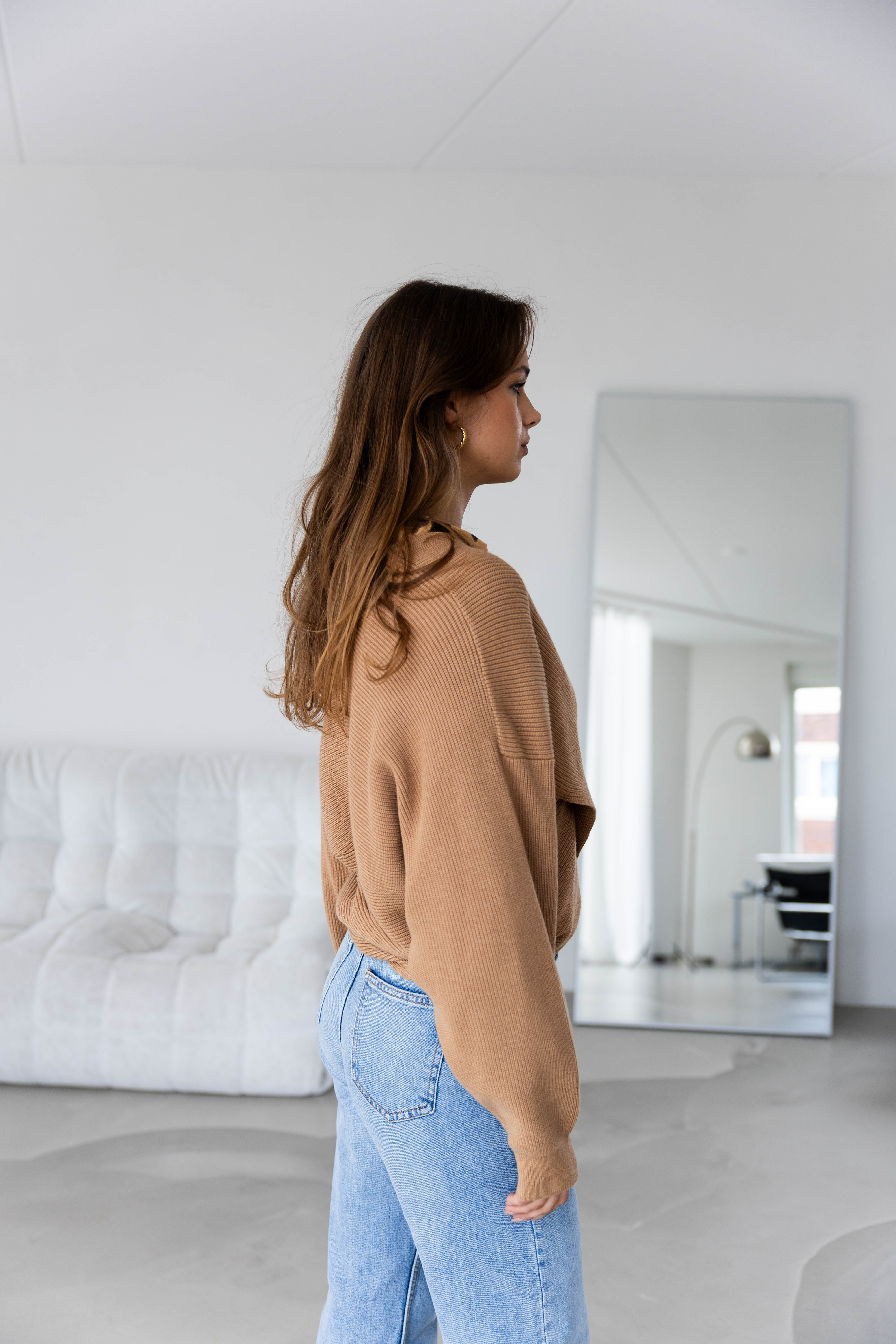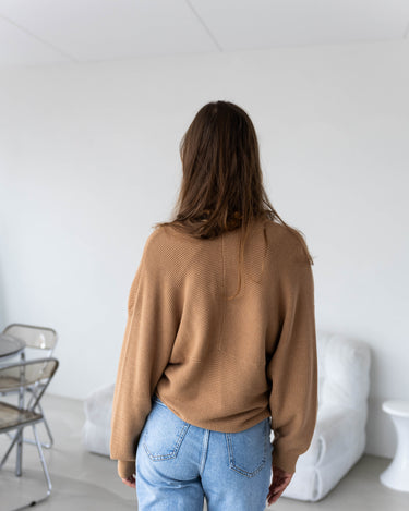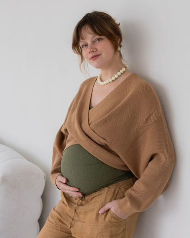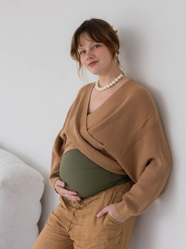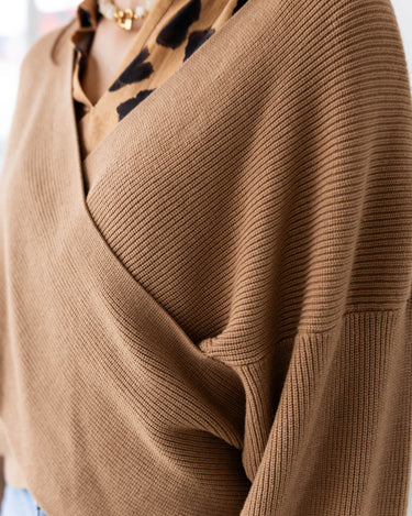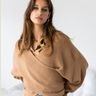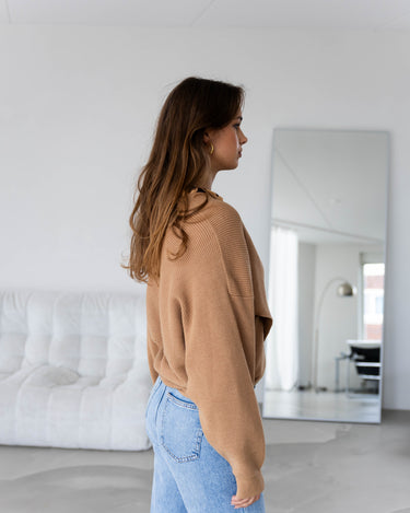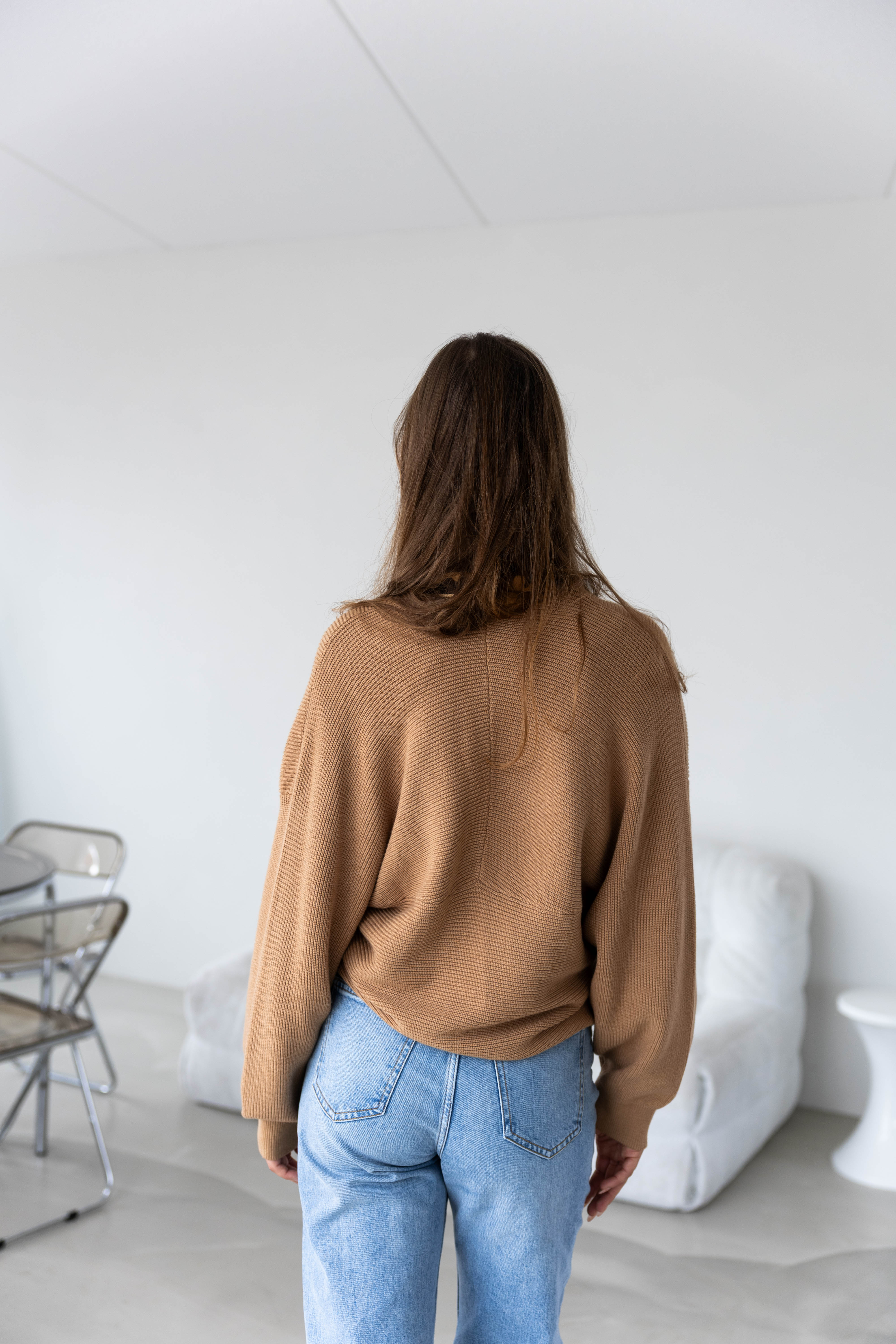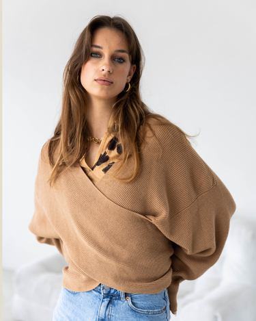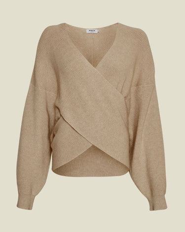 Gebreide, veelzijdige wikkeltrui van Moss Copenhagen. Draagt lekker zacht en is makkelijk te combineren met andere laagjes.