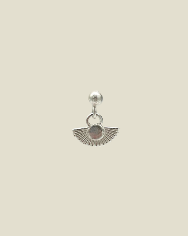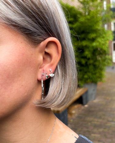 Een elegante oorbel in de vorm van een waaier, uitgevoerd in zilverkleurig metaal. Het verfijnde ontwerp voegt een speelse maar stijlvolle touch toe aan elke look. Perfect voor dagelijks gebruik of om je outfit net dat beetje extra karakter te geven