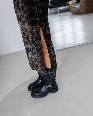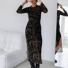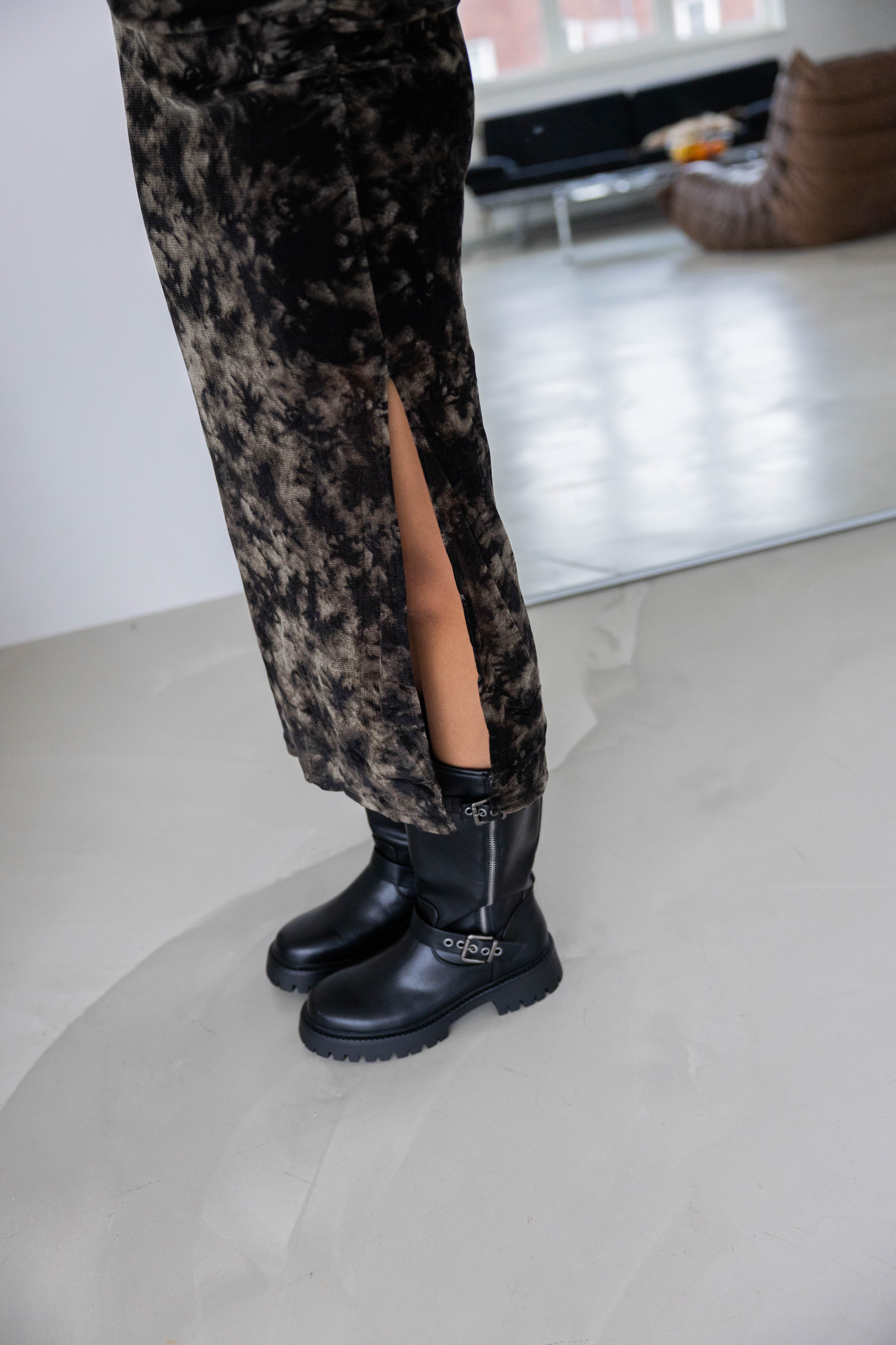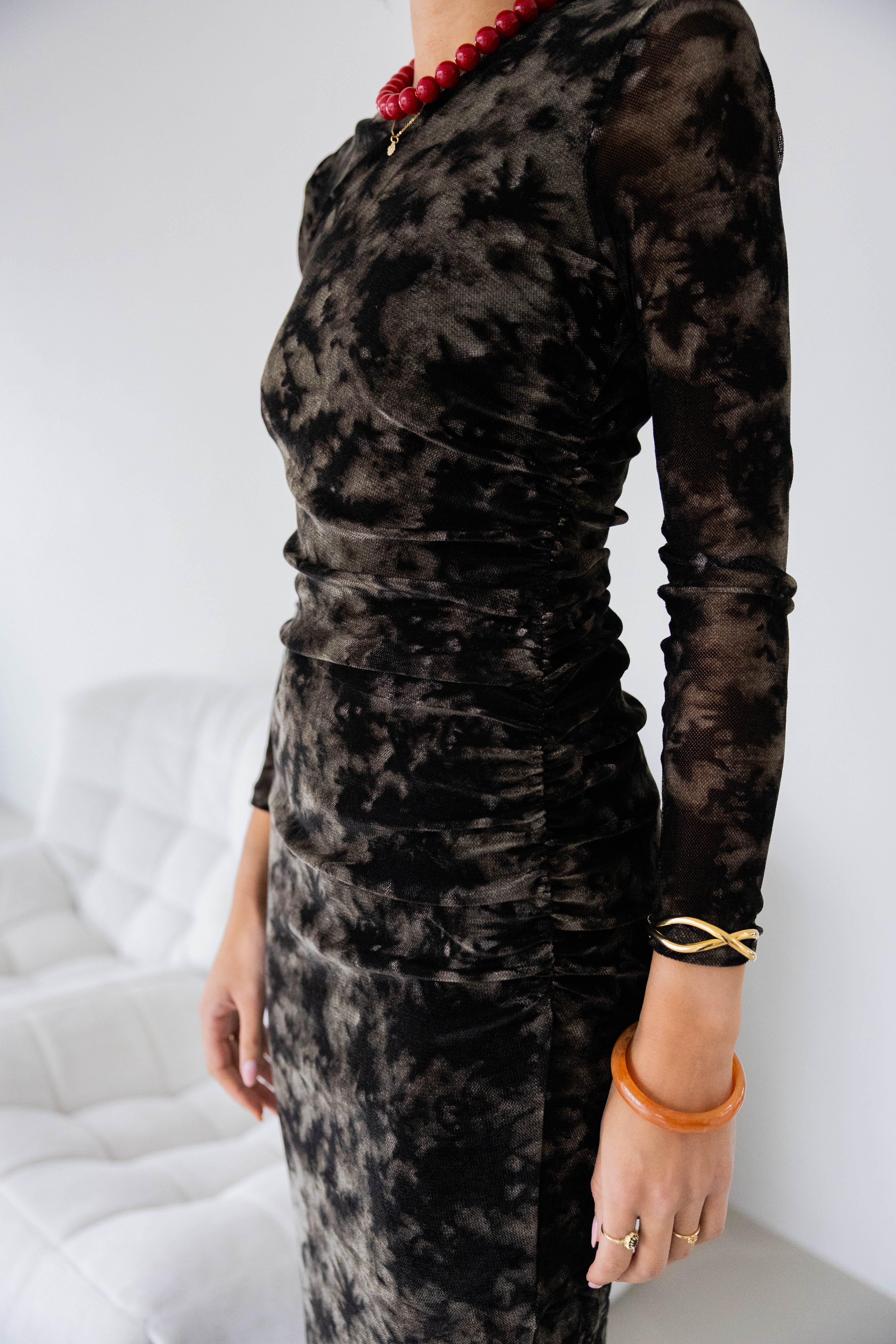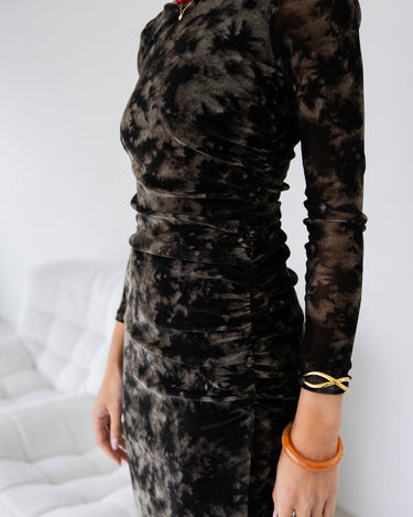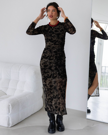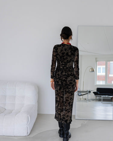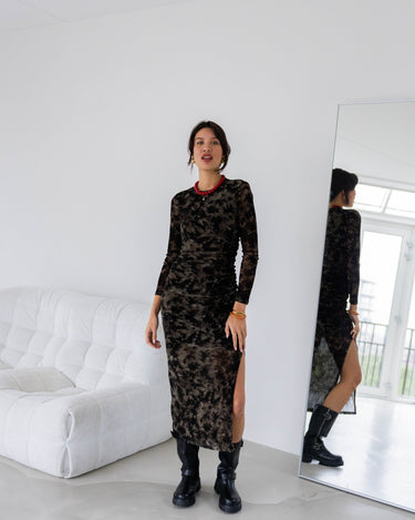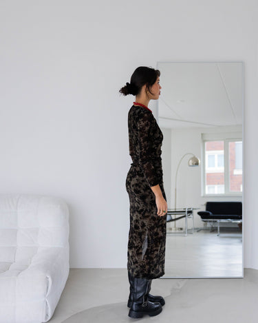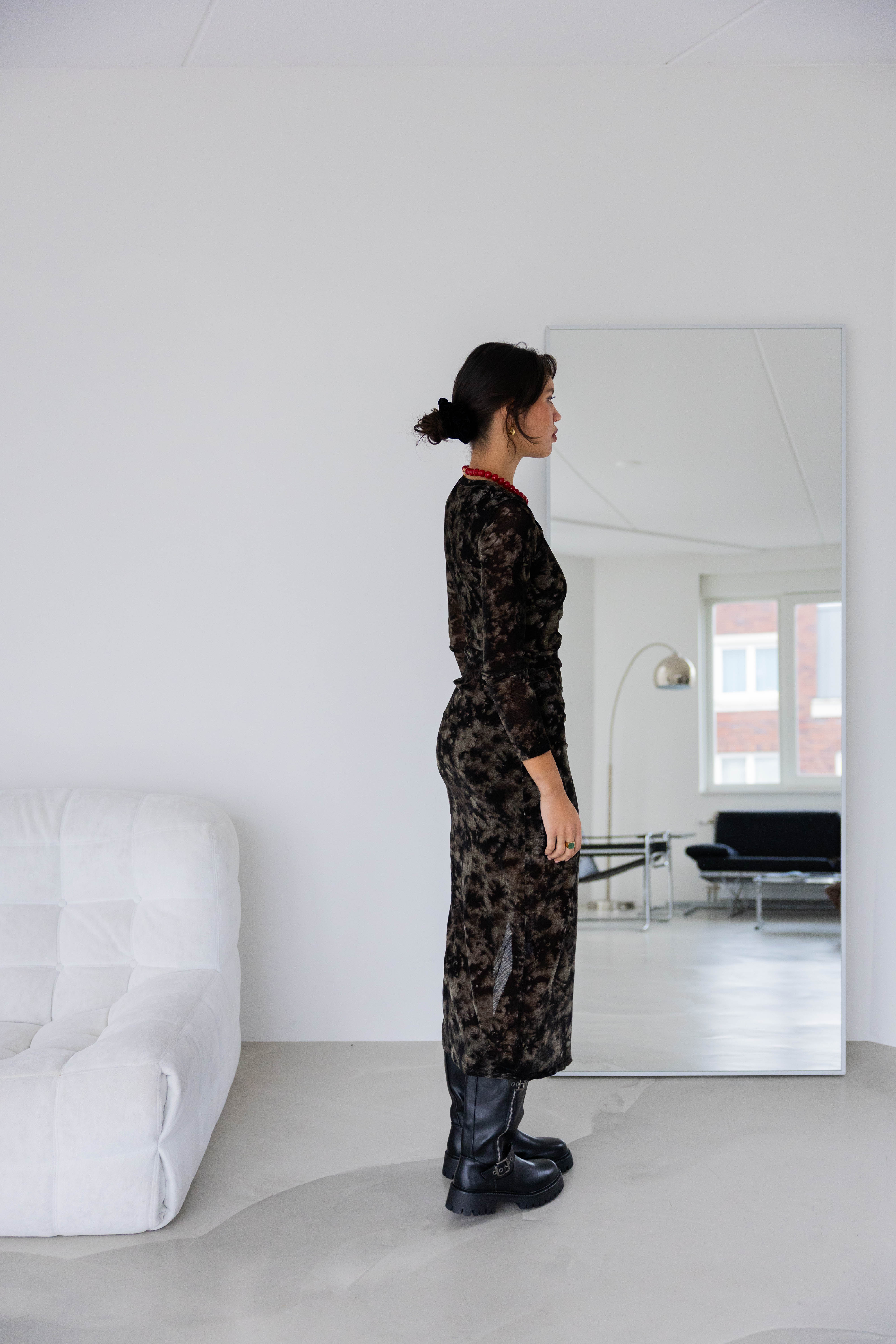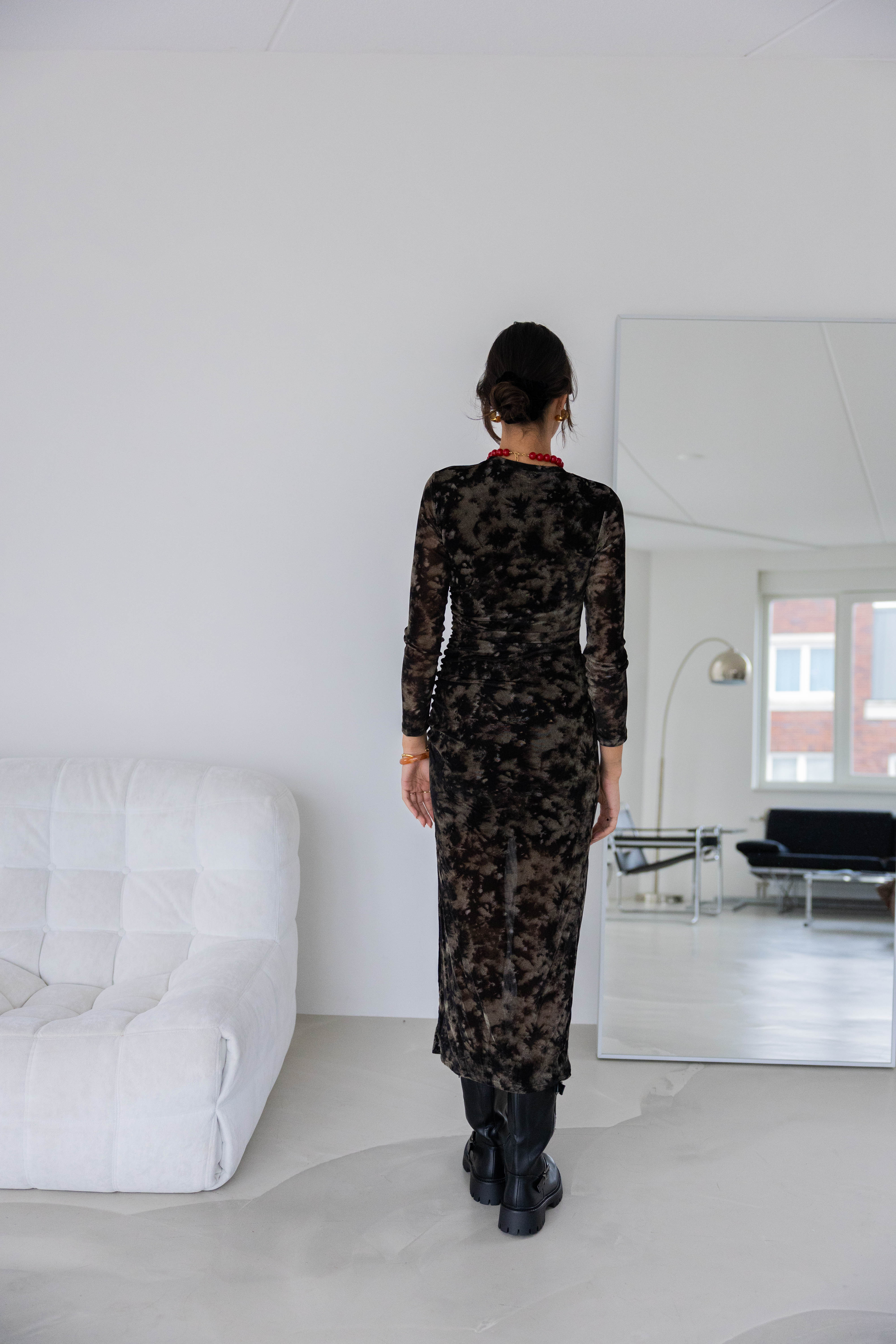 De Bruna Dress is een elegante en vrouwelijke jurk met een moderne twist. De jurk is gemaakt van een khaki-kleurige stof met een zachte zwarte flockprint, wat zorgt voor een speels reliëf en een luxe uitstraling.