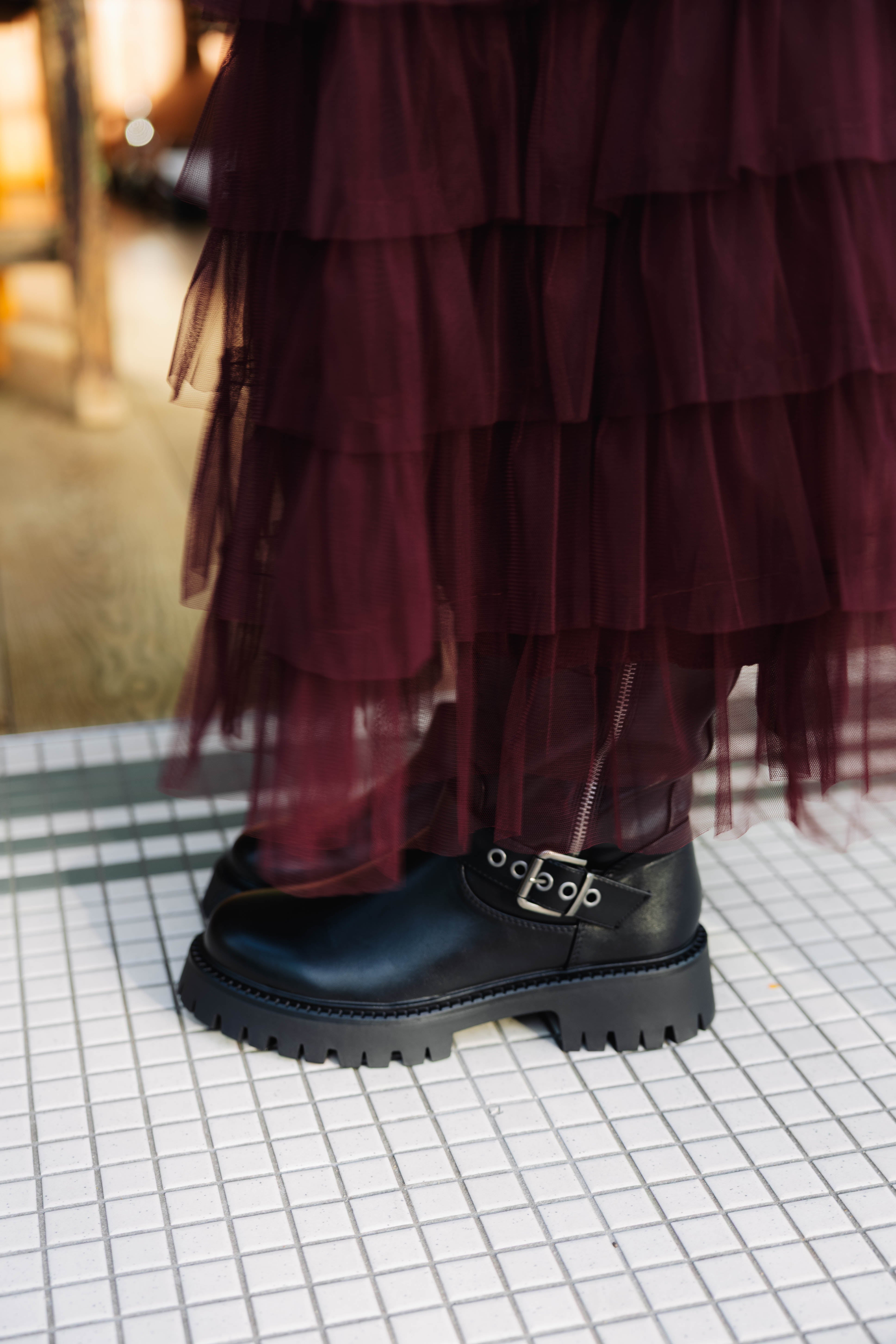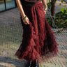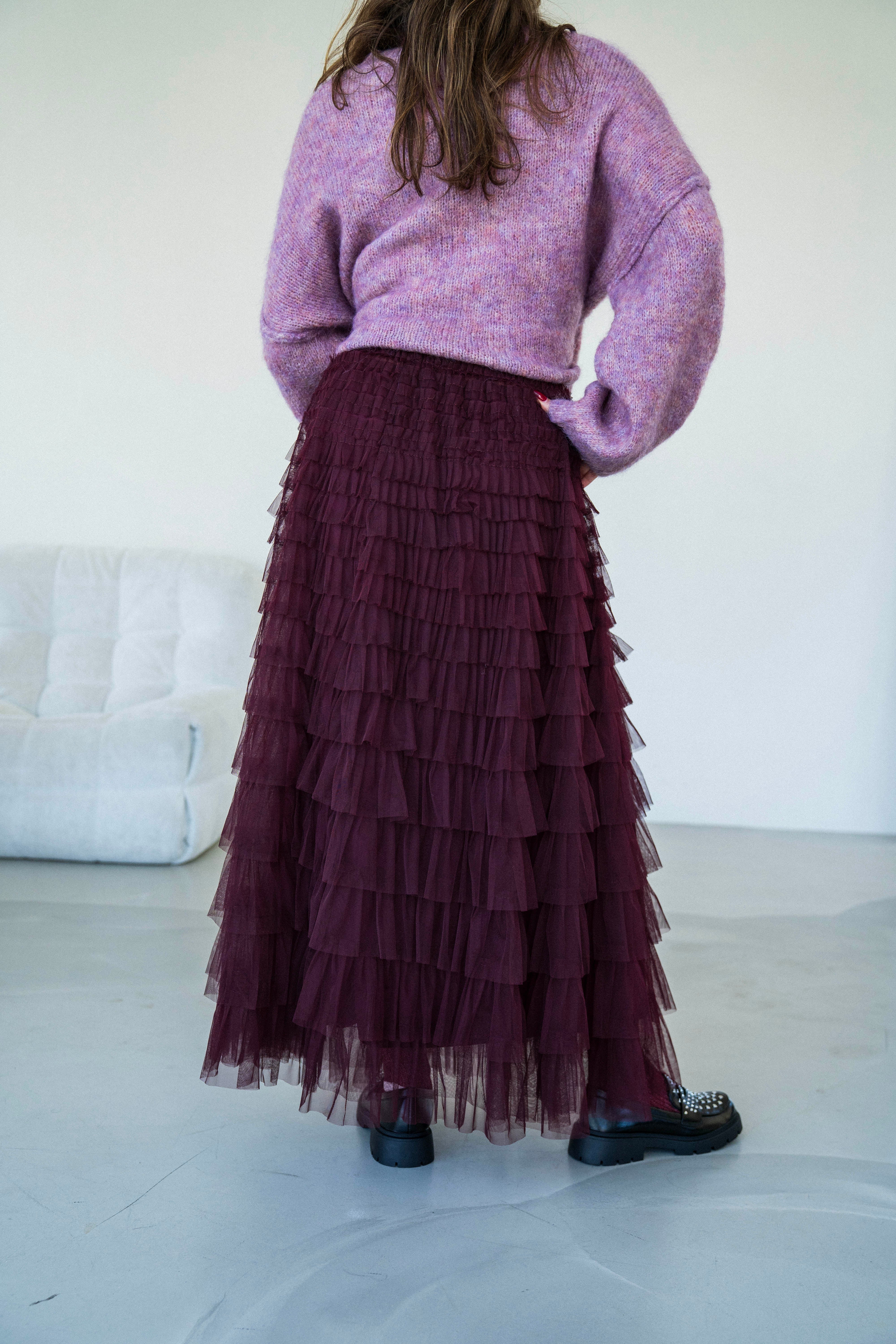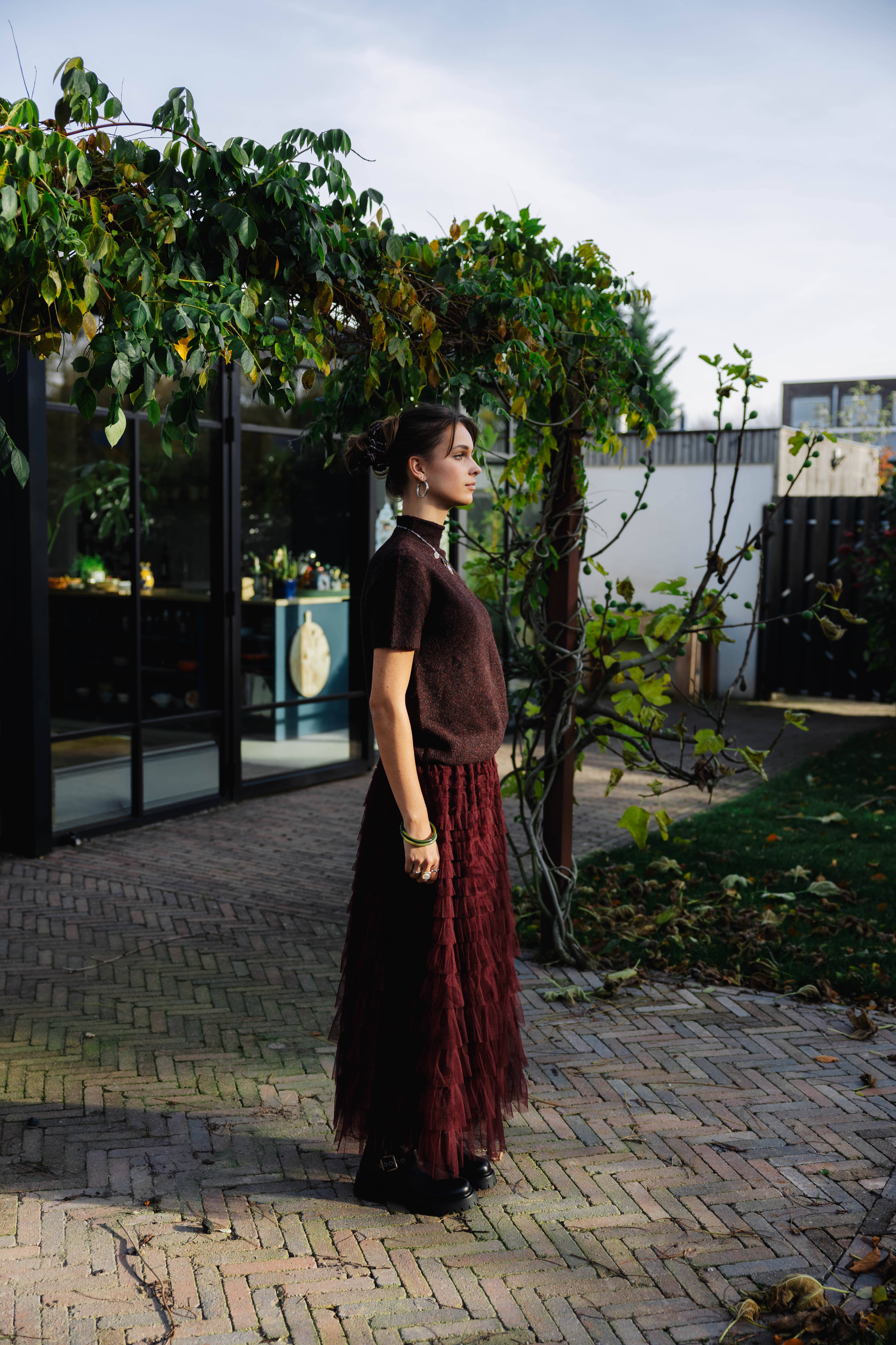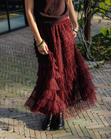 Een funky rok van een tulle. De rok heeft meerdere lagen tullen en valt tot net boven de enkels. Combineer hem met een grove trui en boots.
