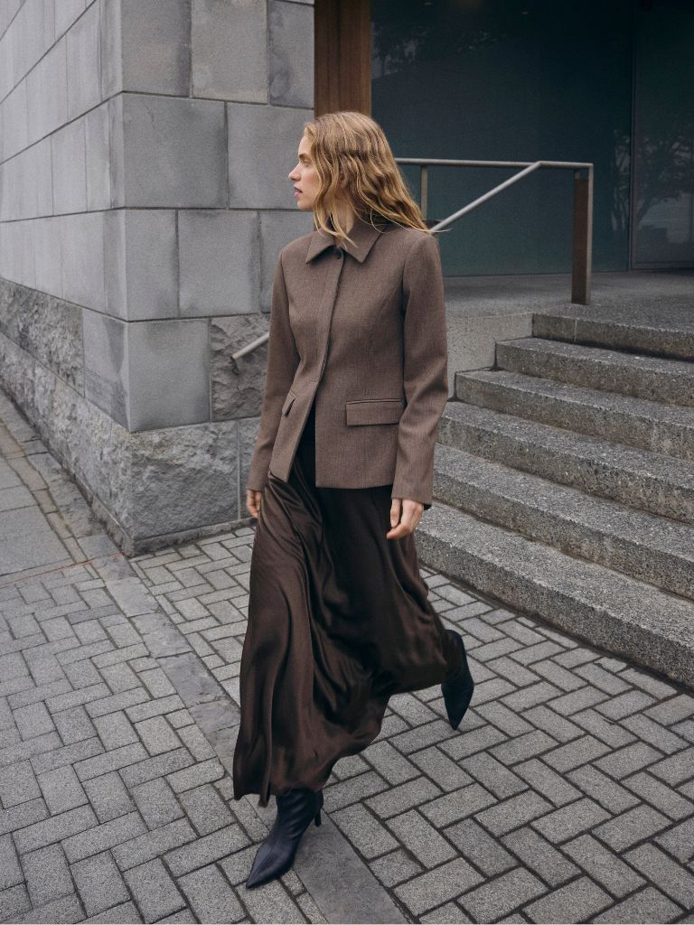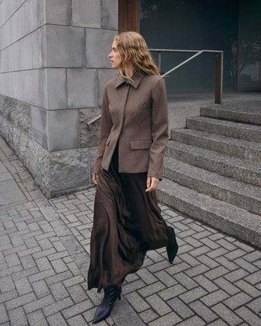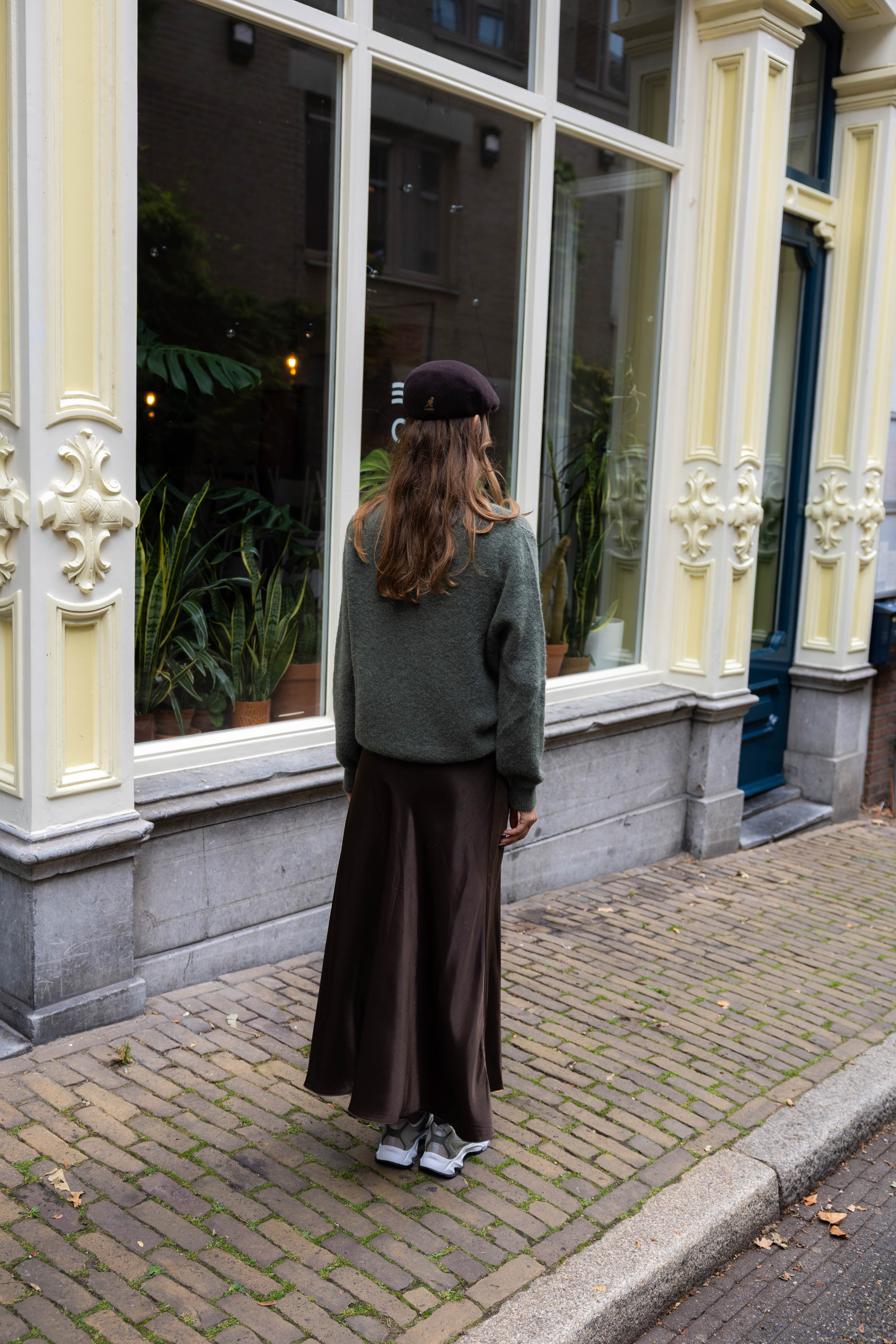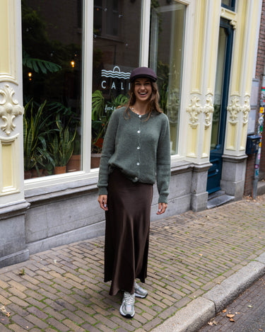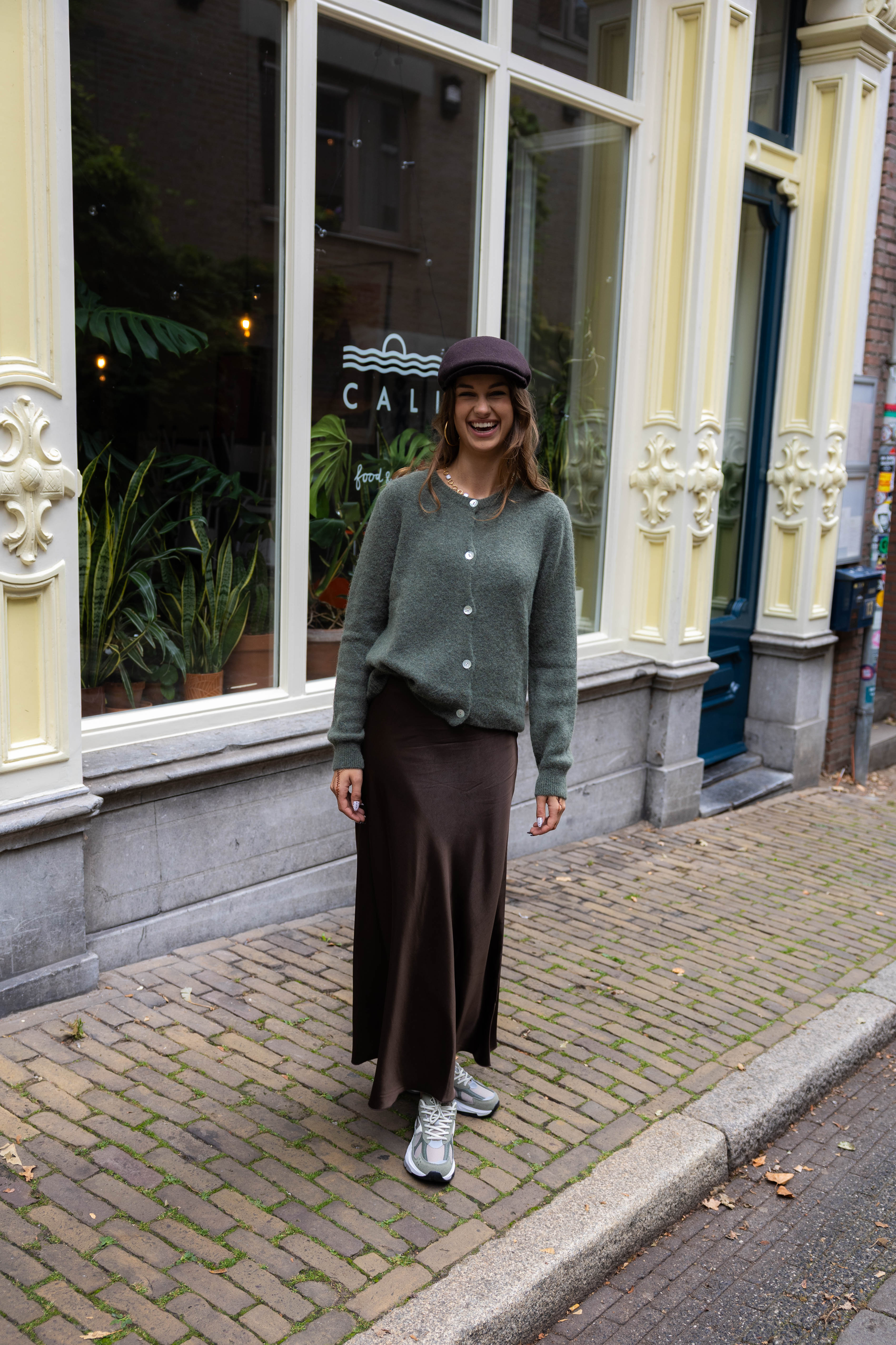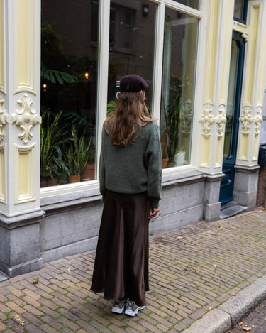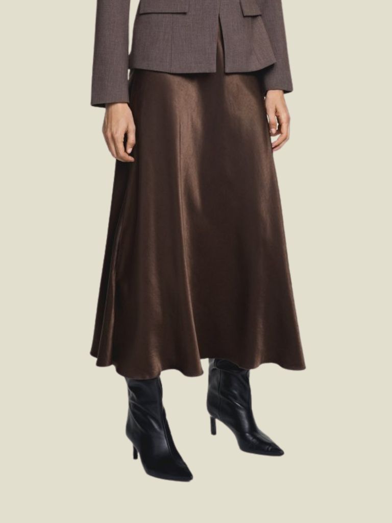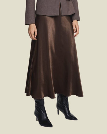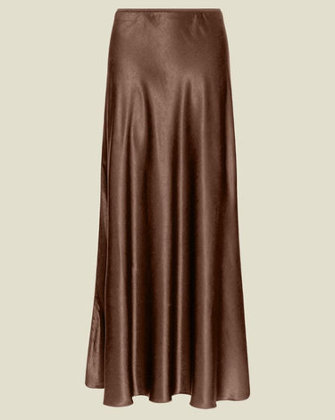 Lange, glanzende, zwierige rok van Moss Copenhagen. Ideaal voor een feestje of casual te dragen met een mooie knit.