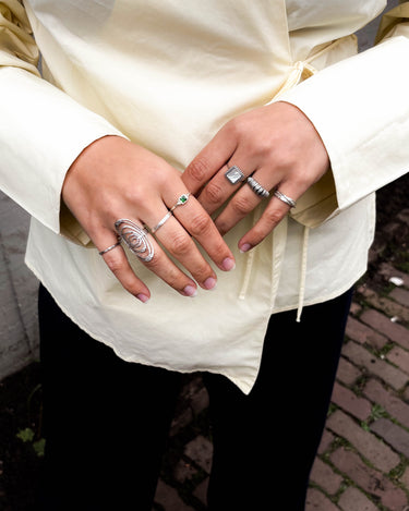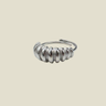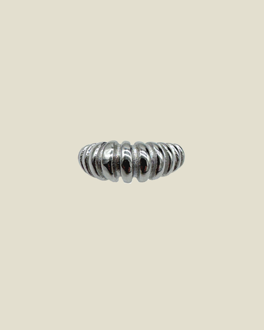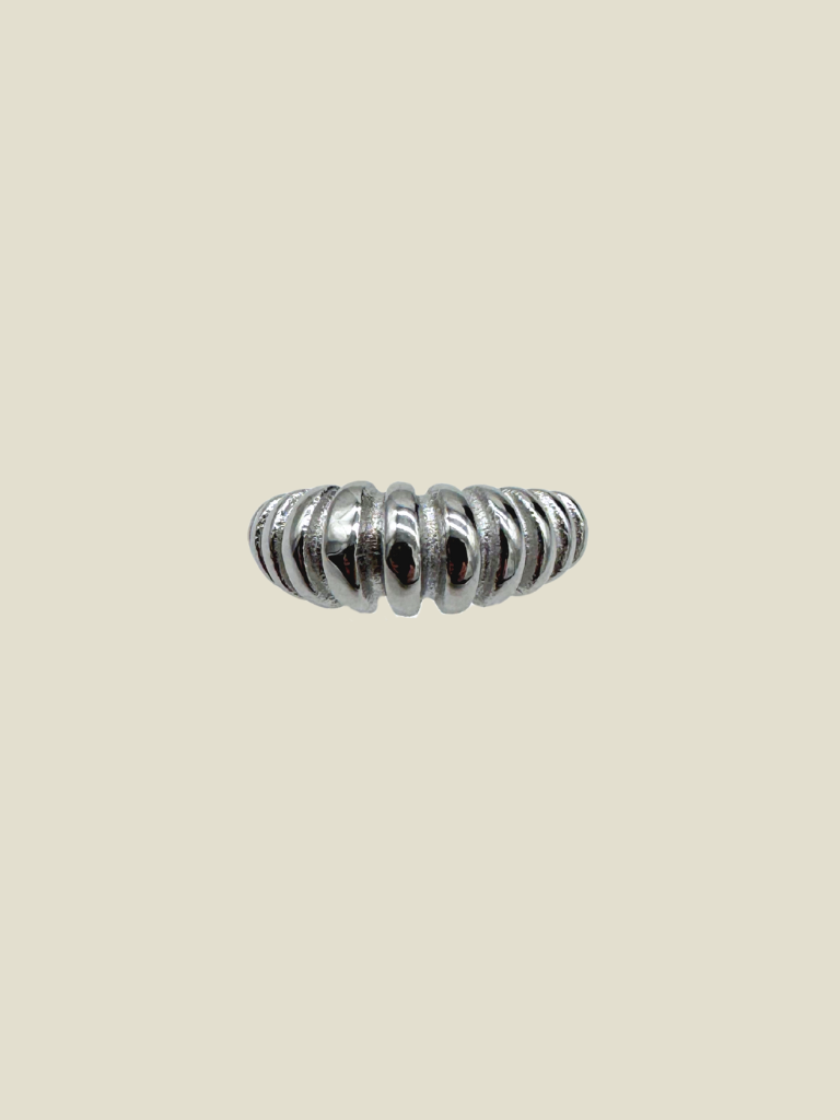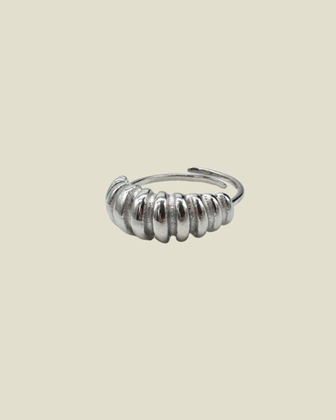 Een speelse, maar stijlvolle ring met een unieke, golvende structuur die doet denken aan een rupsenvorm. De zilverkleurige afwerking geeft een moderne, glanzende touch. Perfect voor wie houdt van subtiele statement pieces met karakter.