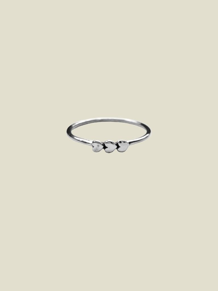 Ring Triple Tiny Heart Silver. Drie minuscule hartjes vormen samen één statement op deze delicate zilveren ring. Perfect voor wie subtiele elegantie combineert met een vleugje romantiek.