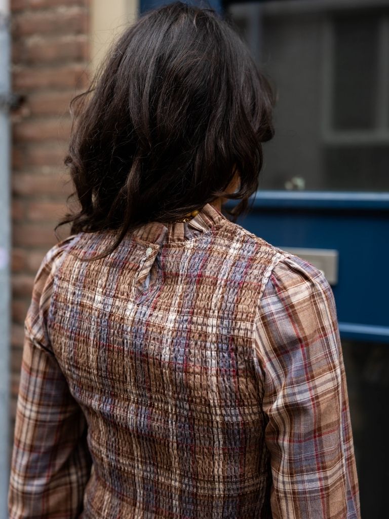De Blouse Kelsie Brown is een elegante en vrouwelijke blouse met een klassiek geruit patroon in warme bruintinten. Het gesmokte lijfje sluit mooi aan, terwijl de plooien aan de onderkant en de lichte pofmouwen een speels en verfijnd detail toevoegen. Het kraagje met subtiele plooitjes maakt het geheel af en geeft de blouse een charmante en stijlvolle uitstraling. Perfect te combineren met een pantalon, rok of jeans voor een verzorgde en modieuze look.
