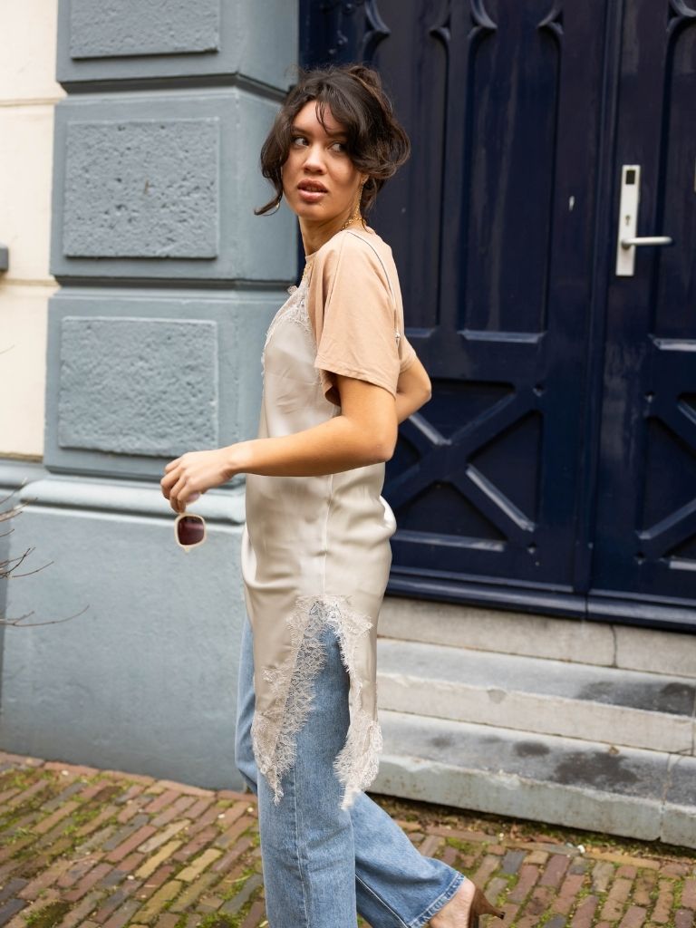 De Dress Victoria Silver is een elegante en vrouwelijke jurk in een glanzende zilveren kleur. De asymmetrische onderkant geeft de jurk een speels en modern effect, terwijl de kanten randjes zorgen voor een verfijnde en delicate touch. Perfect om trendy mee te layeren over een top, blouse of pantalon voor een unieke en modieuze look.