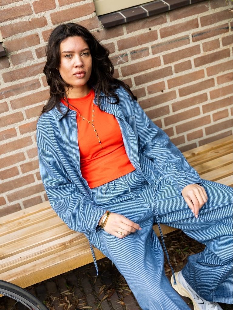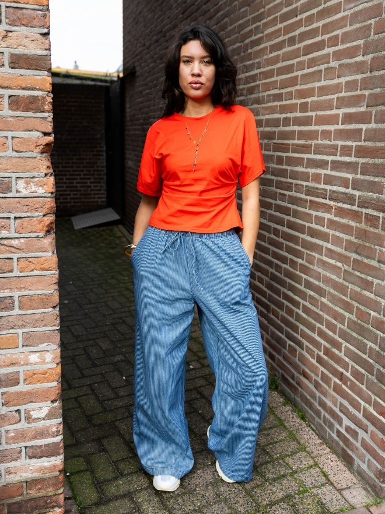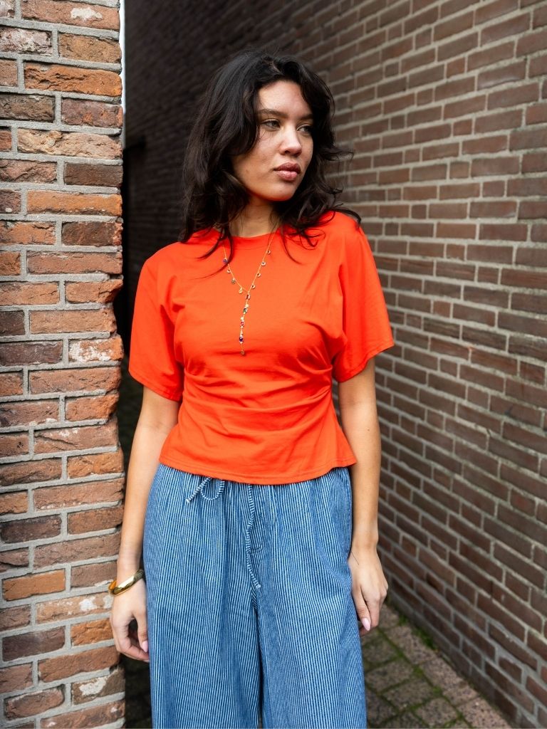 Het Tshirt Victoria Orange is een stijlvolle en vrouwelijke top in een warme kleur tussen oranje en rood in, die meteen een frisse en opvallende touch aan je outfit geeft. Het subtiele geplooide effect aan de zijkanten zorgt voor een mooi getailleerd silhouet, terwijl de kleine split aan de achterkant een speels detail toevoegt. Comfortabel en elegant tegelijk, ideaal om te dragen op een jeans, pantalon of rok voor een verzorgde en moderne look.