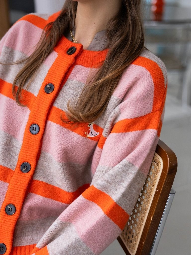 Het Danaine Gris vest van FRNCH is een vrolijke must-have met een boxy fit. De rode, roze en beige strepen maken ‘m speels, terwijl de afstekende knopen en het schattige geborduurde eendje nét dat extra detail geven.