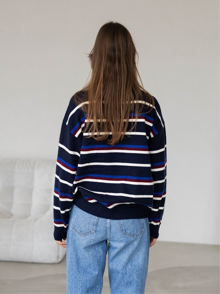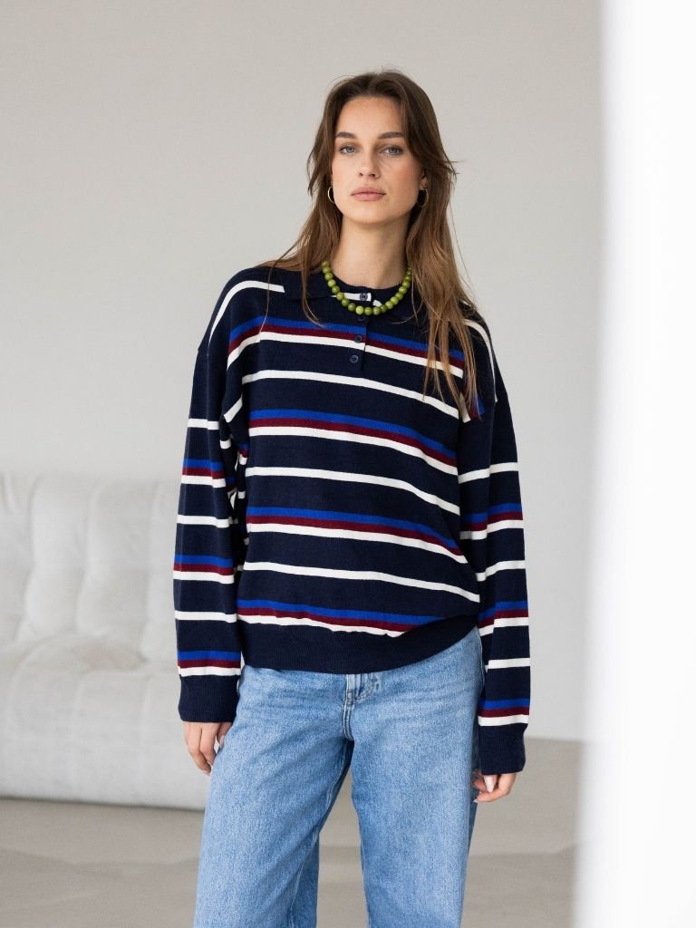 De Polo Pippa in Coffee is een fijngebreide trui in polo-stijl met een oversized fit voor een casual en moderne uitstraling. Het zwaardere, steviger breisel geeft de trui extra structuur en een luxe gevoel. De trui heeft een donkerbruine basis met meerlaagse strepen in ecru, burgundy en kobalt blauw, wat een frisse, stijlvolle touch geeft. Het polo-kraagje met knoopsluiting bij de nek maakt het geheel af. Verkrijgbaar in 1 maat, makkelijk te combineren met jeans, een rok of over een jurk voor een relaxed, stylish effect.