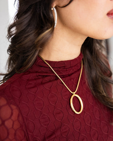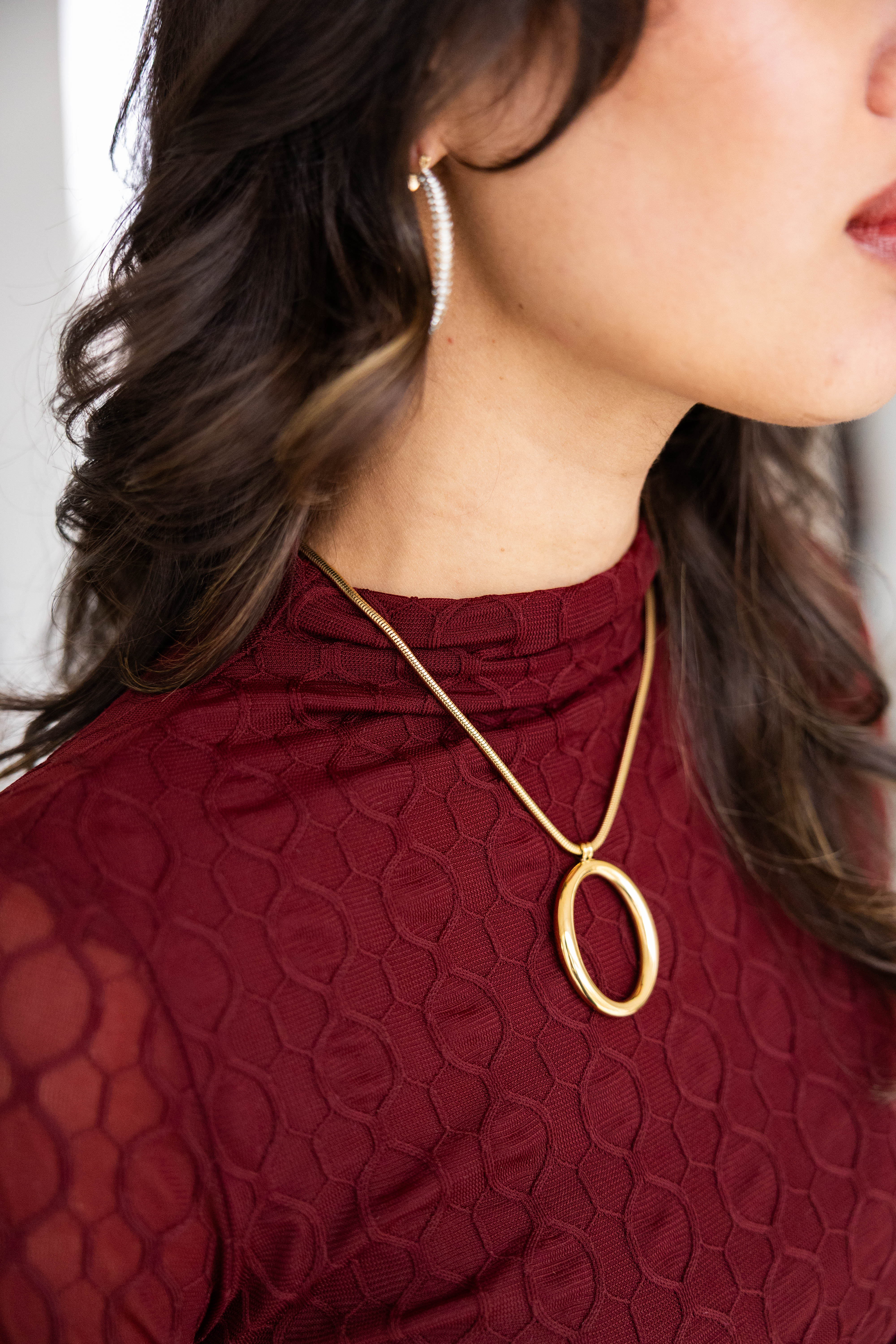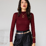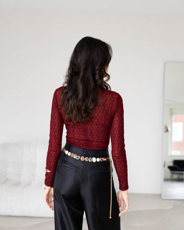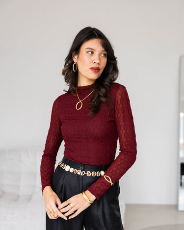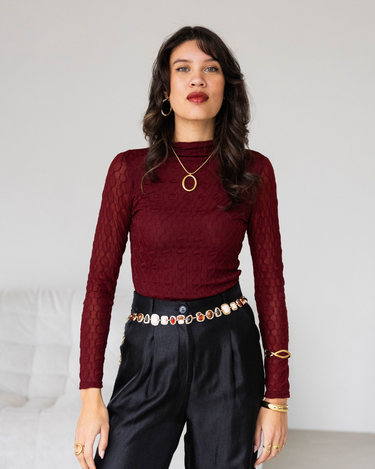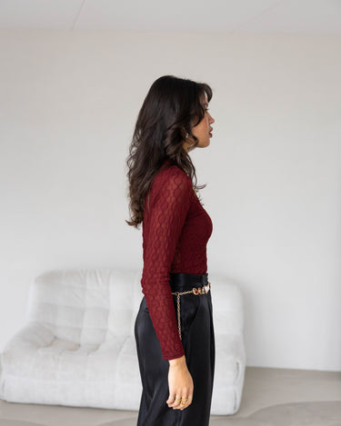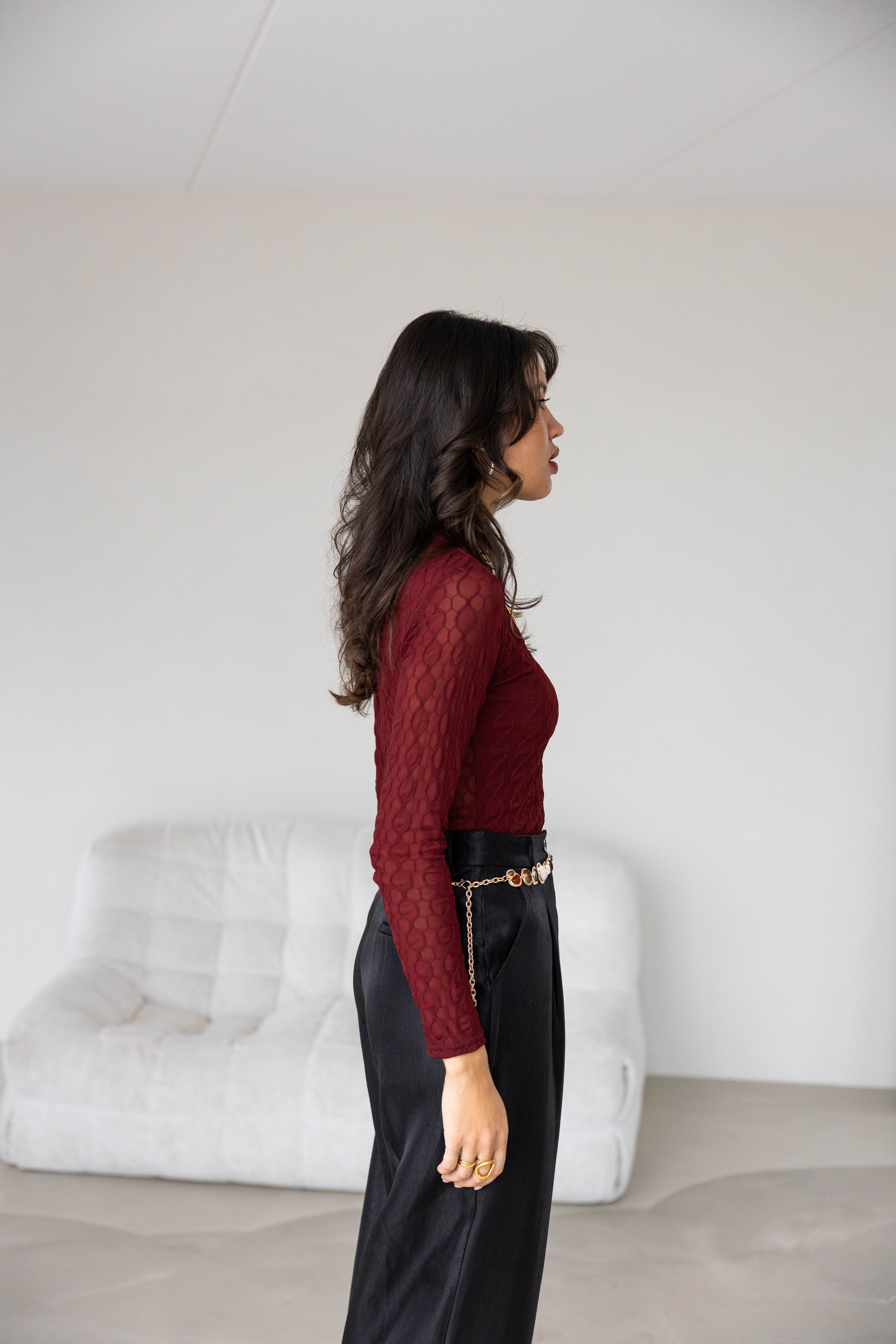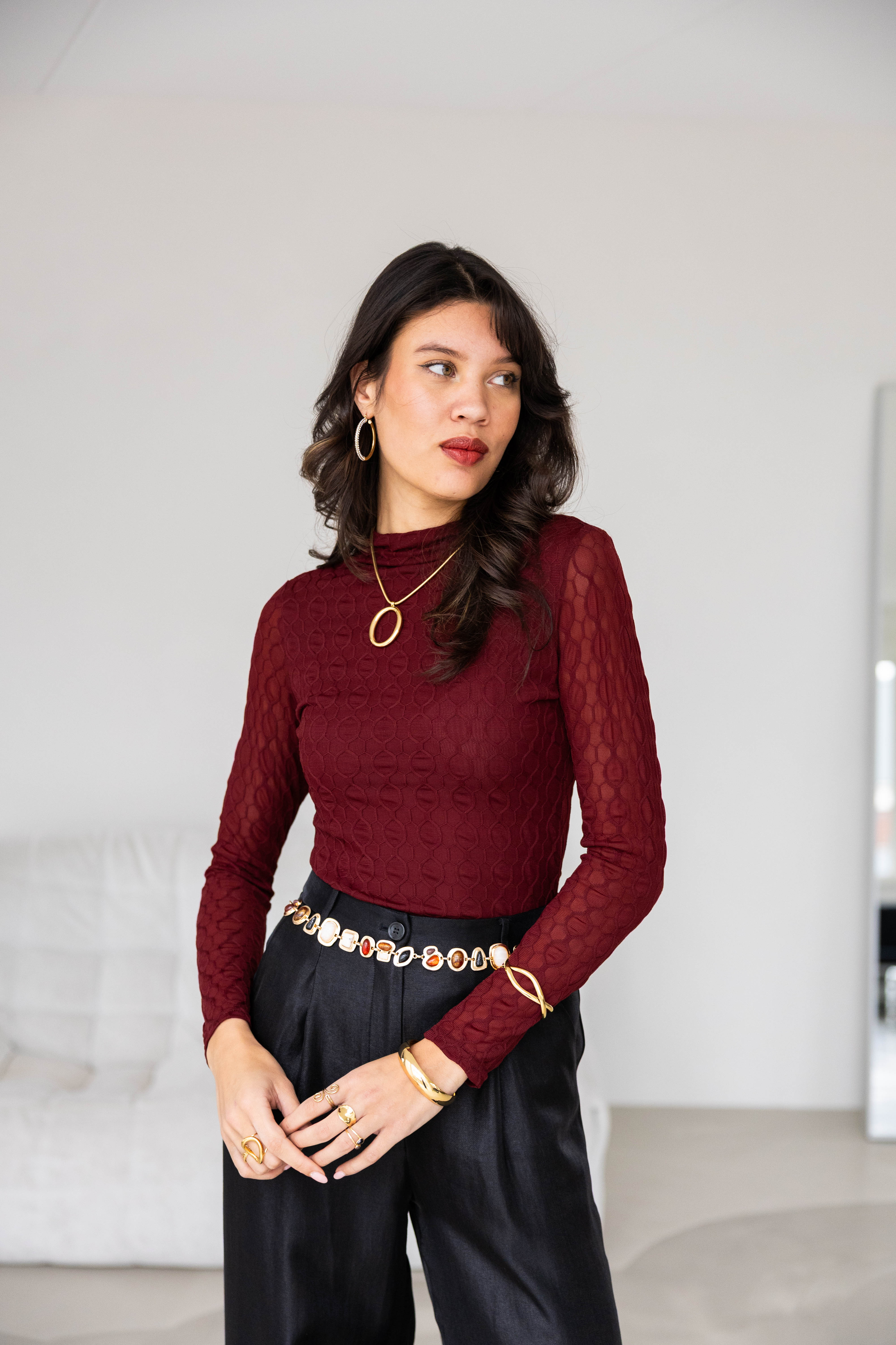 De Bodil Body is een aansluitende top in een diepe bordeaux kleur, met een klein opstaand kraagje voor een subtiel detail. De stretchy stof heeft een ingweven honeycomb design, wat de body een speels en iets specialer effect geeft.