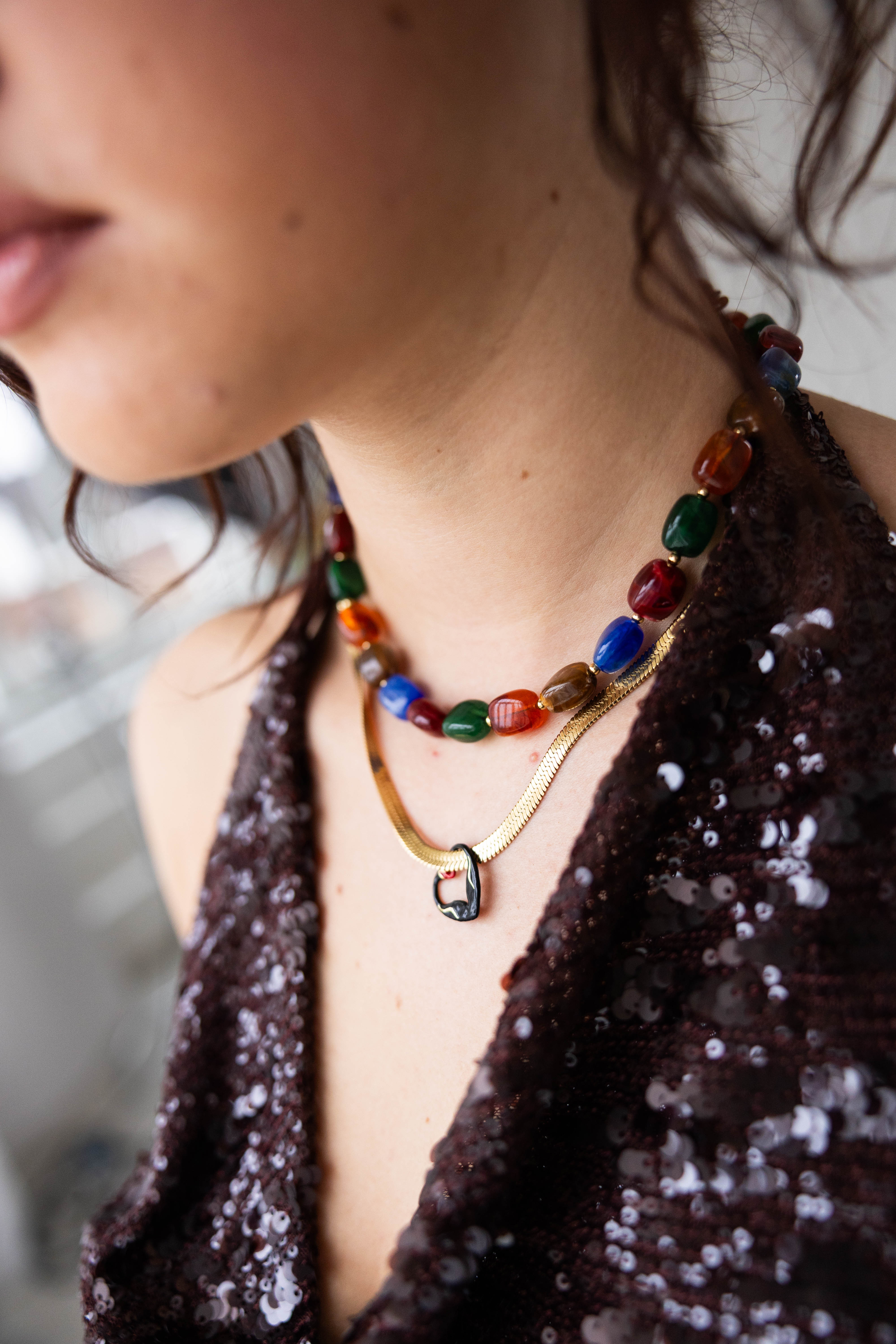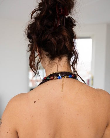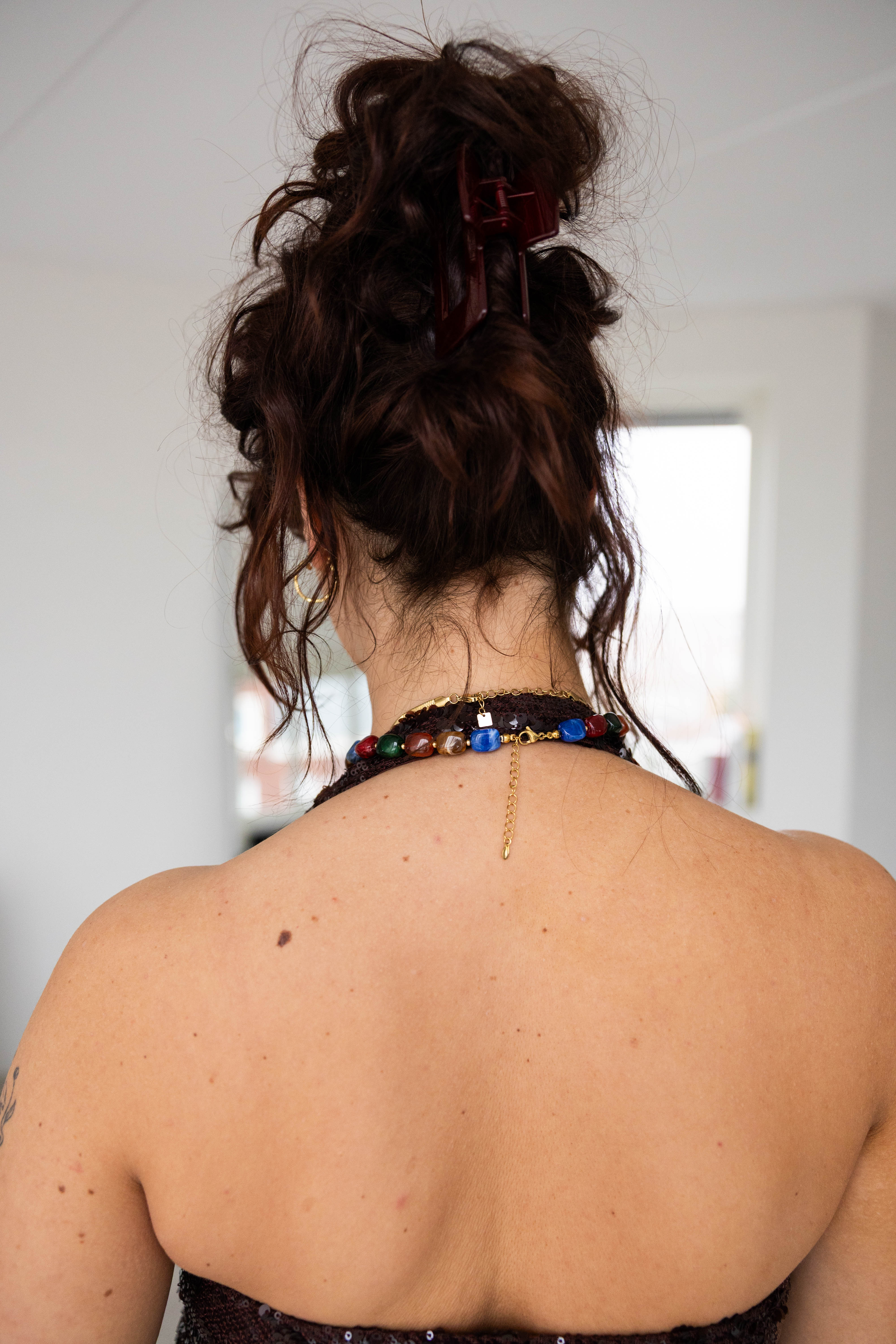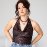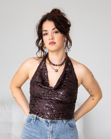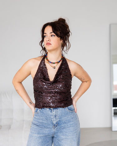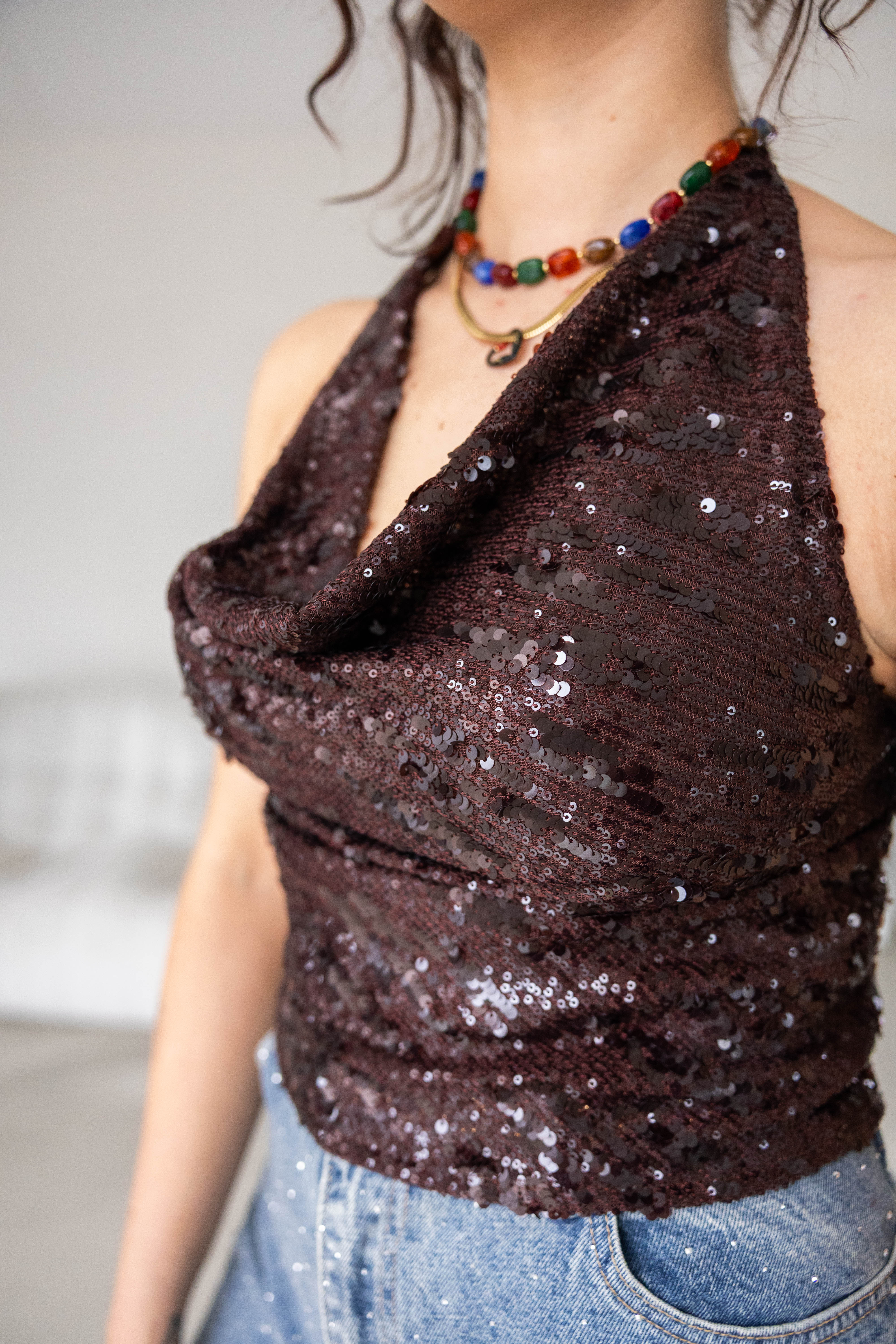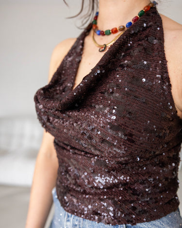 De Imra Top in een elegante bordeaux-bruin tint is de perfecte mix van chique en speels. De halternek en watervalhals creëren een flatterend silhouet, terwijl pailletten in verschillende groottes zorgen voor een subtiele sparkle en een speelse touch. Het kortere model valt mooi in de taille en maakt de top ideaal te combineren met een pantalon of een silky skirt voor een stijlvolle avondlook.
