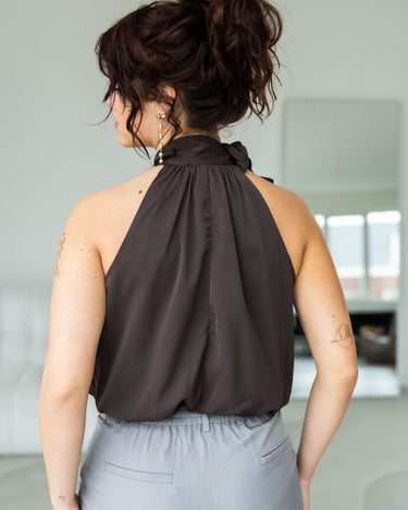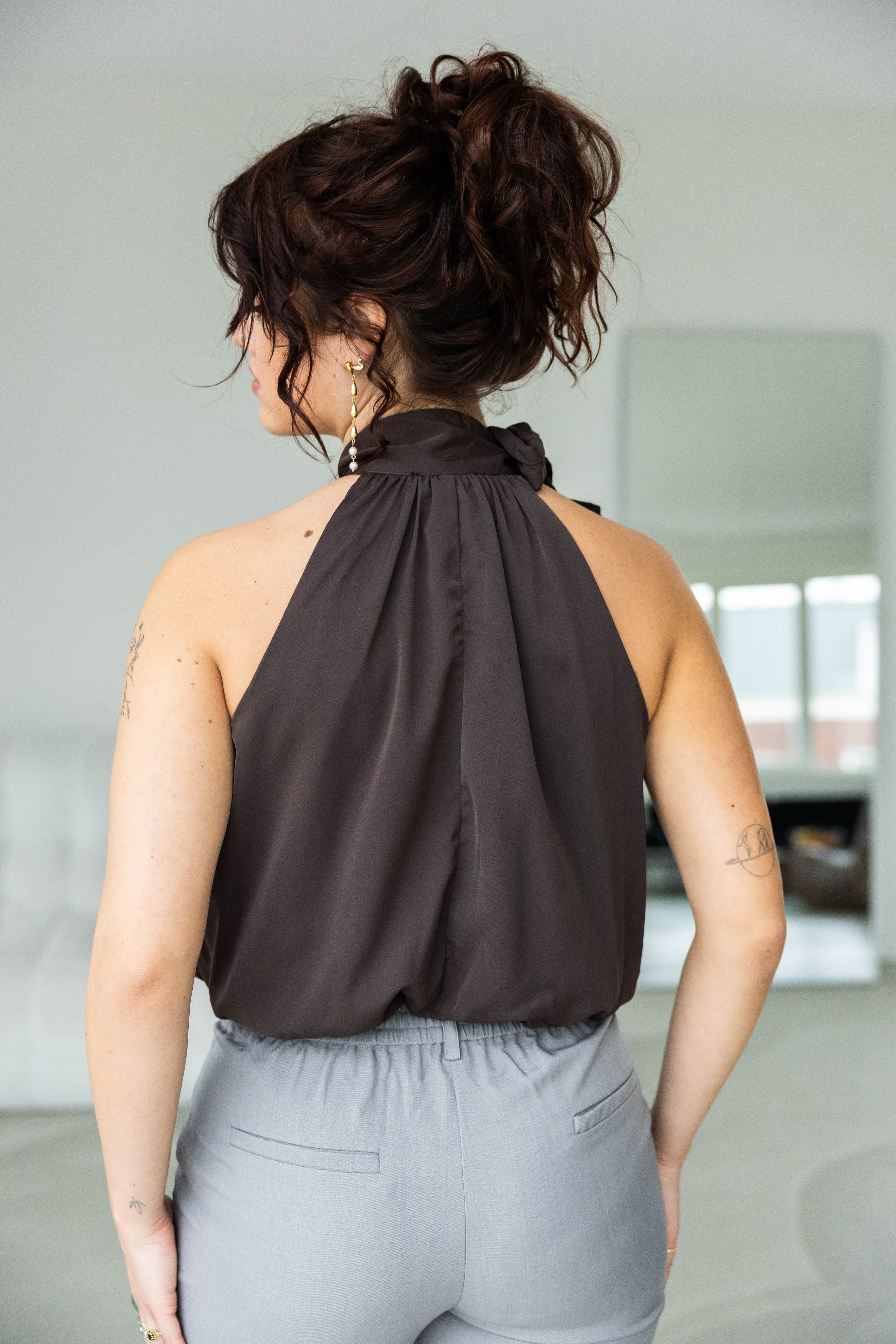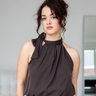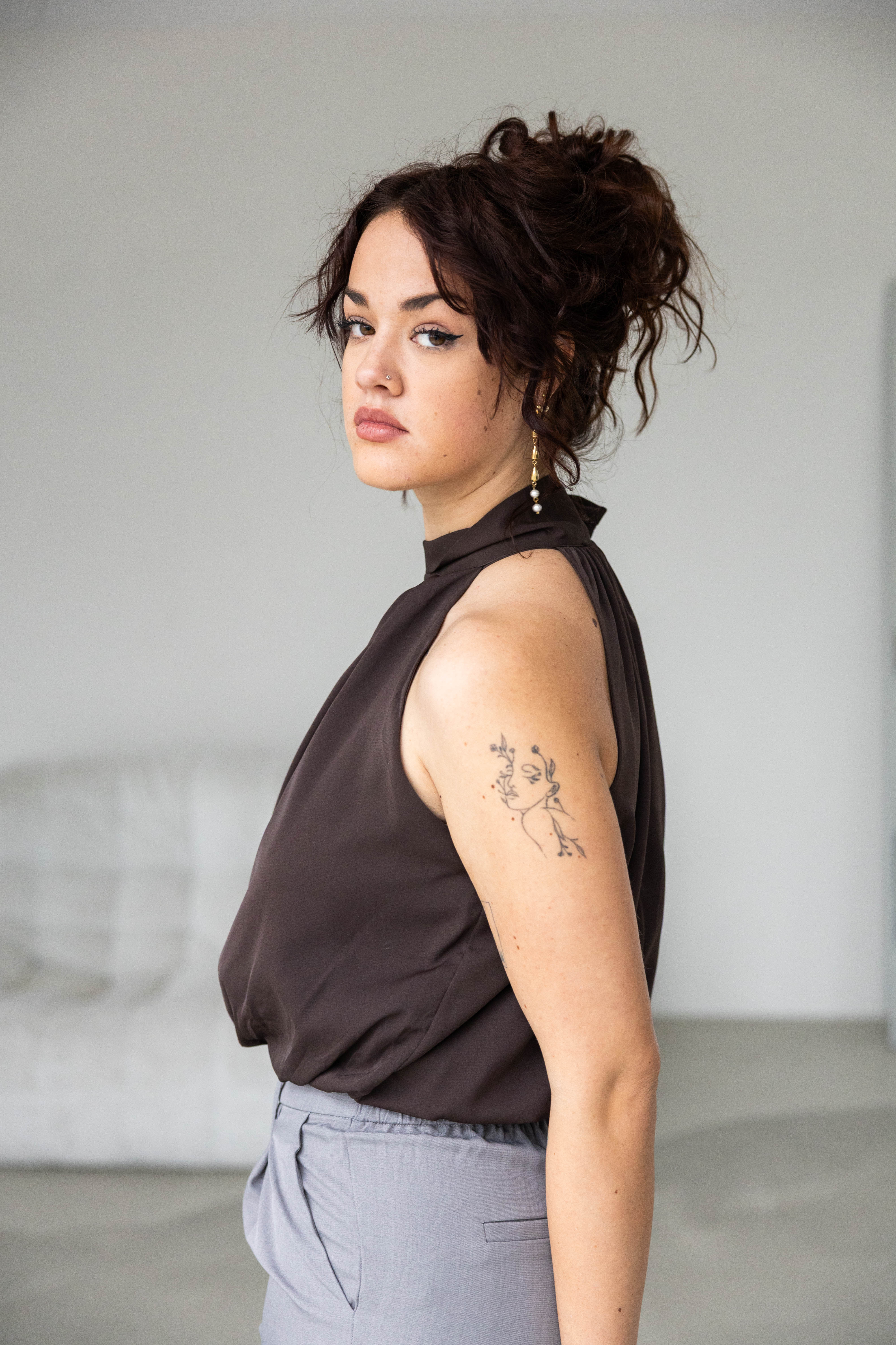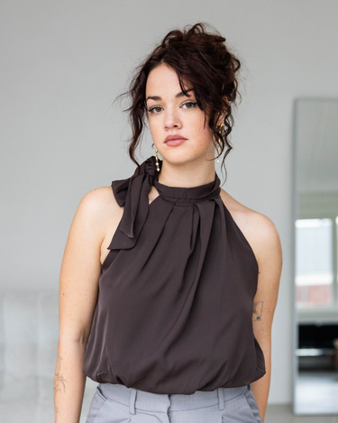 De Top Isou in bordeaux is een echte eyecatcher met een elegante, maar moderne uitstraling. De satijnachtige stof geeft een subtiele glans, terwijl de halternek met striksluiting zorgt voor een vrouwelijke touch. De kortere, wijdere pasvorm valt mooi in de taille en creëert een speels ballon-effect aan de onderkant – perfect te combineren met een rok of high-waist broek.