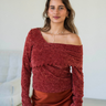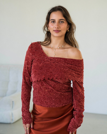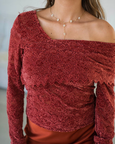 Lange mouwen top met een mooie kanten stof, die aan één kant off-shoulder is.