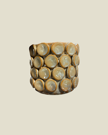 Deze unieke aardewerk pot is een echte eyecatcher in elk interieur. De pot heeft een lichtgroene glazuurlaag met een subtiele glans en is versierd met 3D-achtige platte bolletjes die zorgen voor een speels, ambachtelijk effect.
