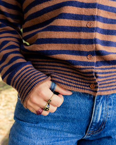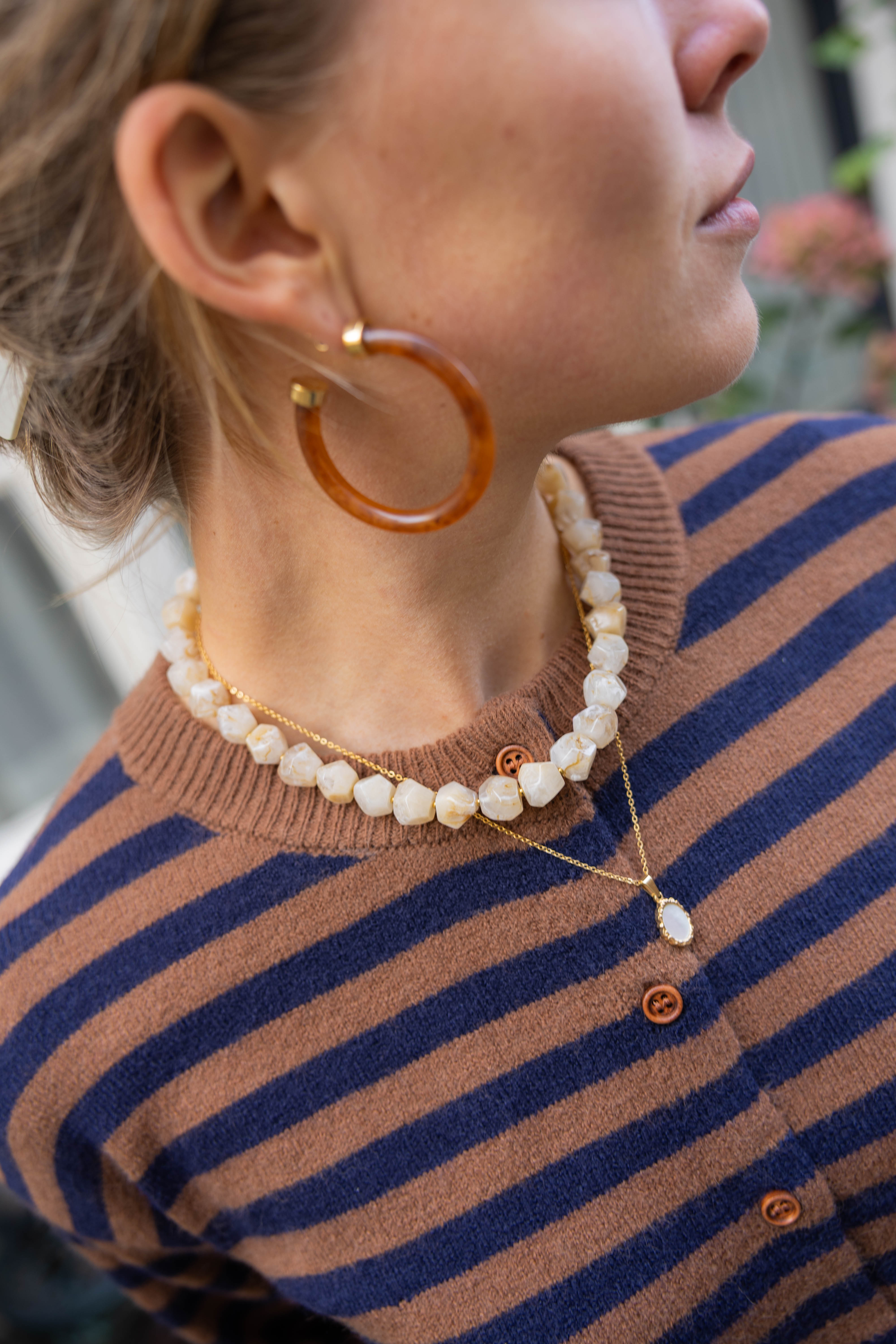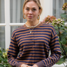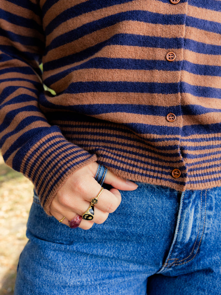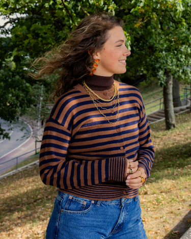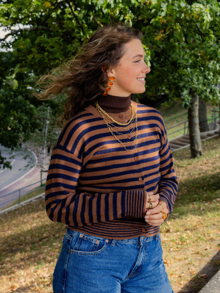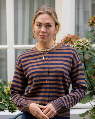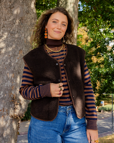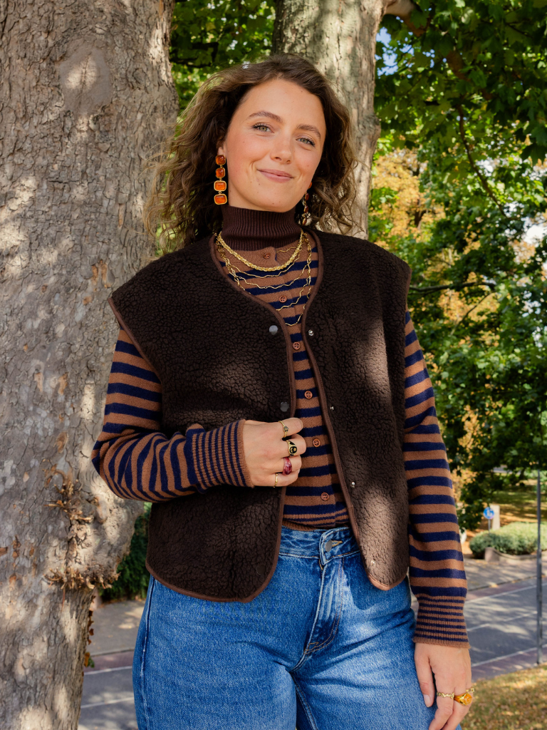 Zacht vest met strepen. Leuk te combineren met een stoere jeans of onder een gilet voor een gelaagde look.