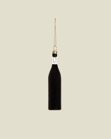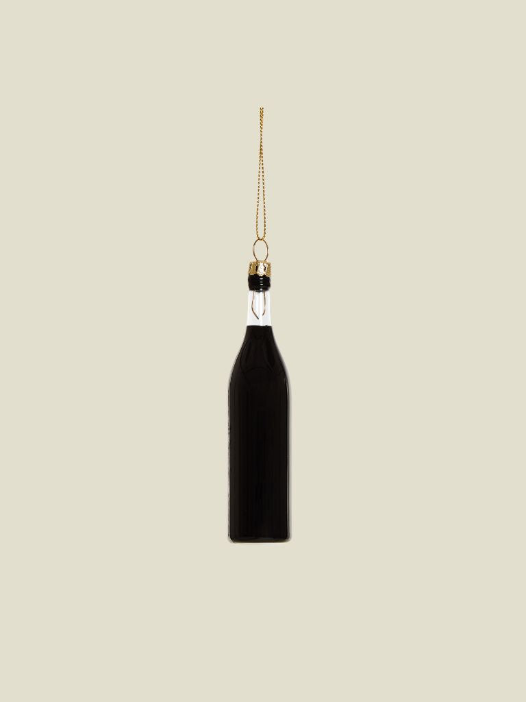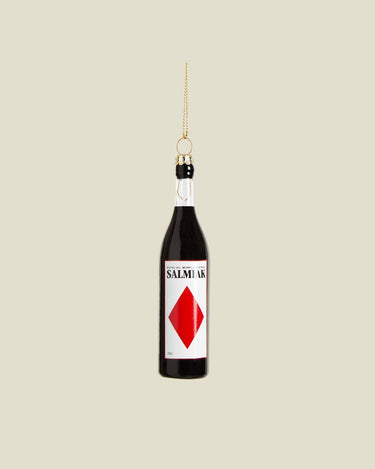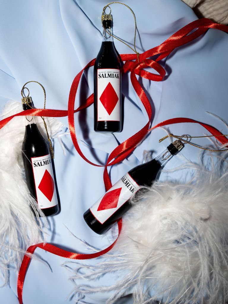 Prachtig glazen kerstornament in de vorm van een salmiak flesje.