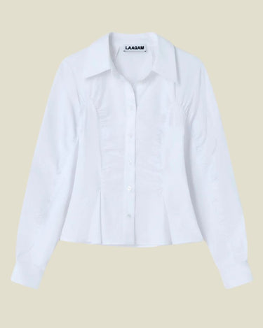 Poplin overhemd met lange volumemouwen. Gerimpelde naden langs mouw en body, zowel aan de voor- als achterkant. Knoopsluiting. Flare stukken details in stof en manchetten.