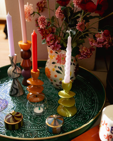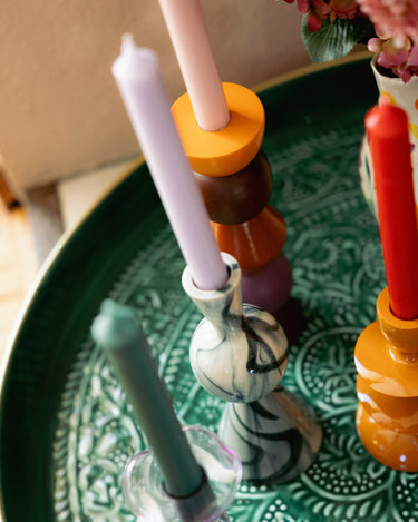 De kaars is verkrijgbaar in twee maten: Small van 19,5 cm hoog en Large van 28 cm hoog, zodat je zelf kiest welke perfect bij je tafelsetting of kamer past.