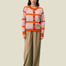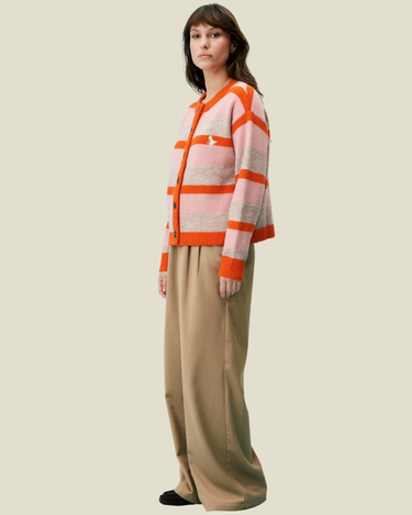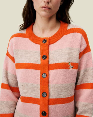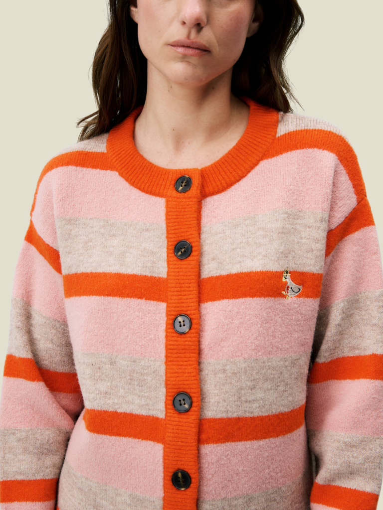 Het Danaine Gris vest van FRNCH is een vrolijke must-have met een boxy fit. De rode, roze en beige strepen maken ‘m speels, terwijl de afstekende knopen en het schattige geborduurde eendje nét dat extra detail geven.