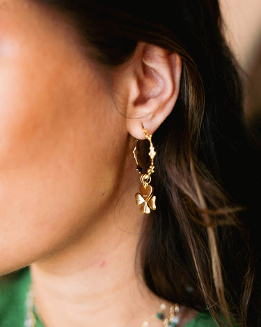 De Charm Lucky Shamrock van Anna+Nina is een speelse en charmante bedel in de vorm van een klavertje vier, symbool van geluk en positiviteit. De charm is gold plated en heeft een subtiele glans die mooi opvalt aan een ketting of oorbel.