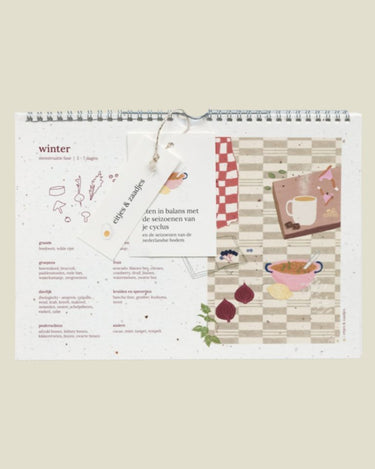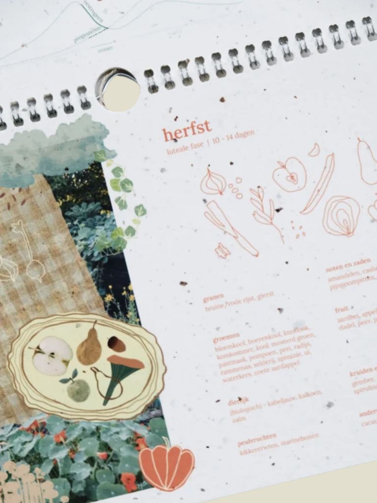 De cyclus kalender laat voor elk seizoen van de menstruatie cyclus zien welke voeding het lichaam nodig heeft. En ook welke lokale, Nederlandse producten daarbij passen. Zo kun je eten in balans met de seizoenen van binnen en buiten.