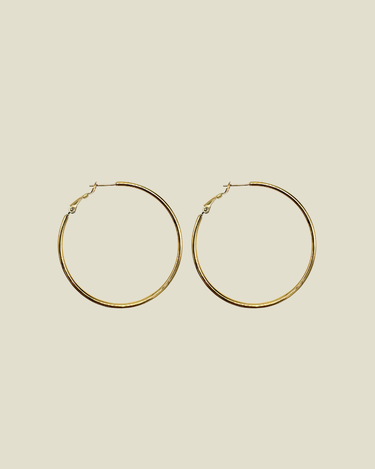Een set tijdloze, goudkleurige hoops met een diameter van 5 cm. Het eenvoudige, klassieke ontwerp maakt deze oorbellen veelzijdig en elegant, perfect om dagelijks te dragen of te combineren met andere oorbellen voor een speels, gelaagd effect.